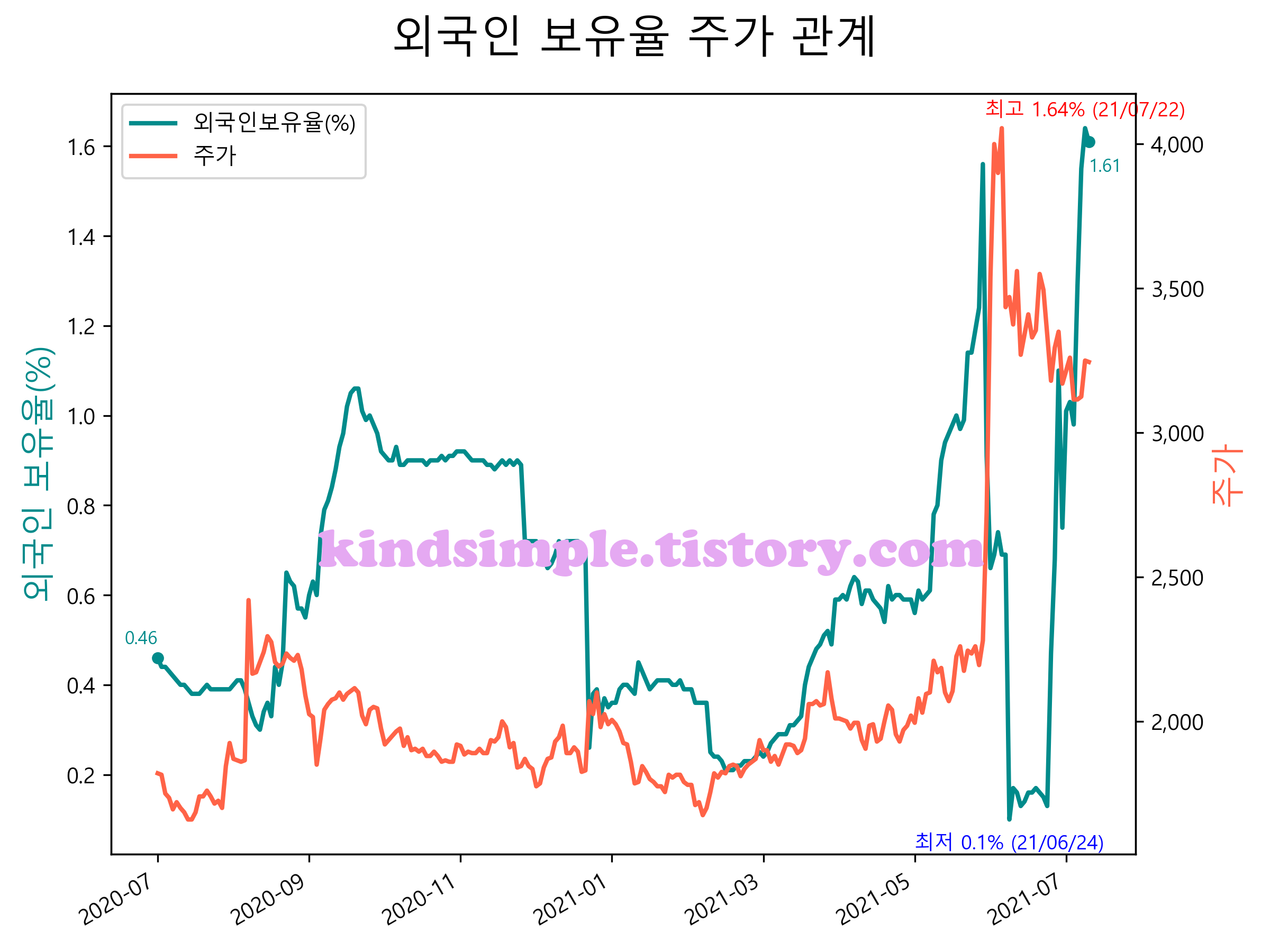 최근 1년간 외국인 보유율 및 주가와의 관계입니다.