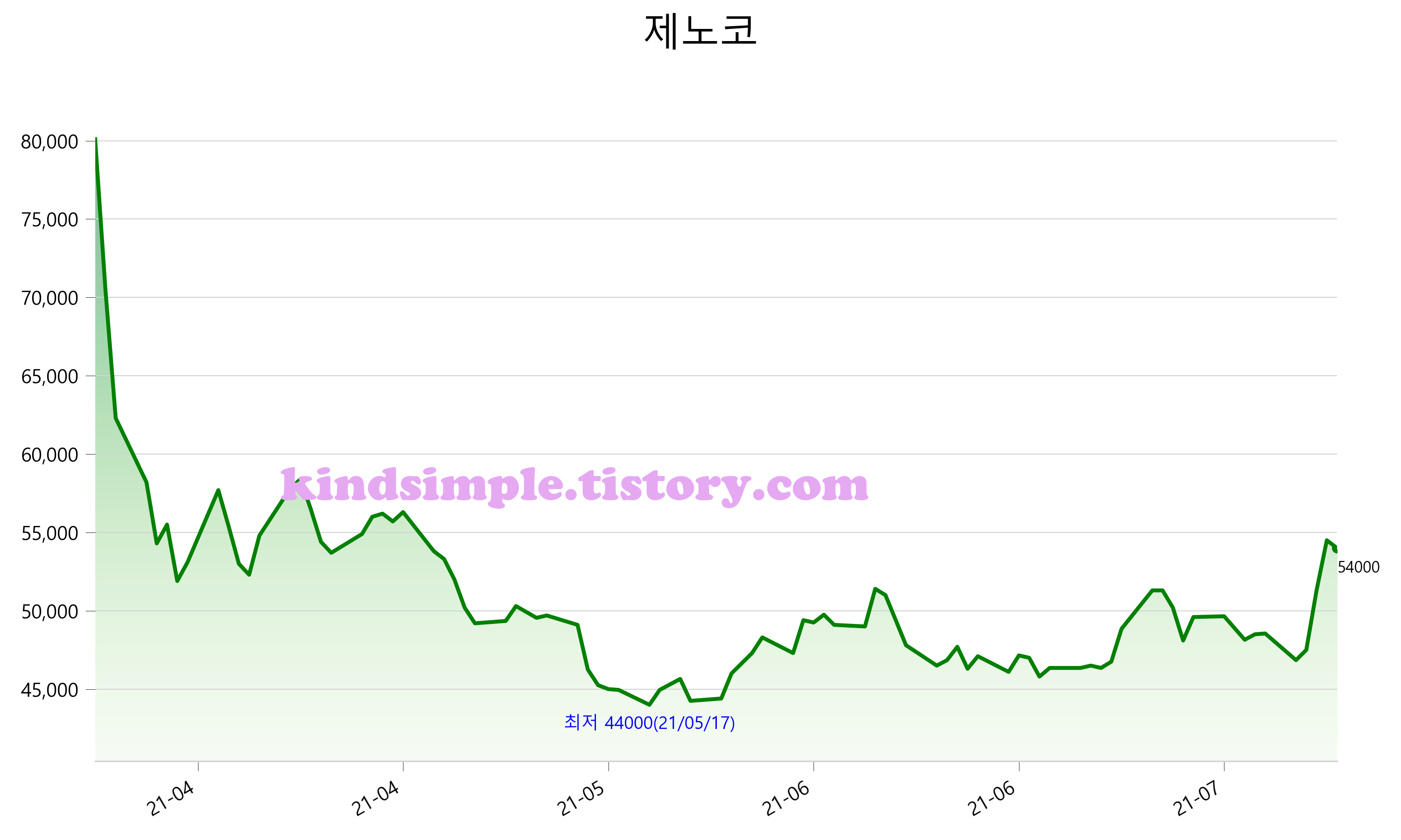 52주 최고가는 80,100원(2021-03-24), 52주 최저가는 44,000원(2021-05-17)으로 52주간 변동률은 -32.6% 입니다.