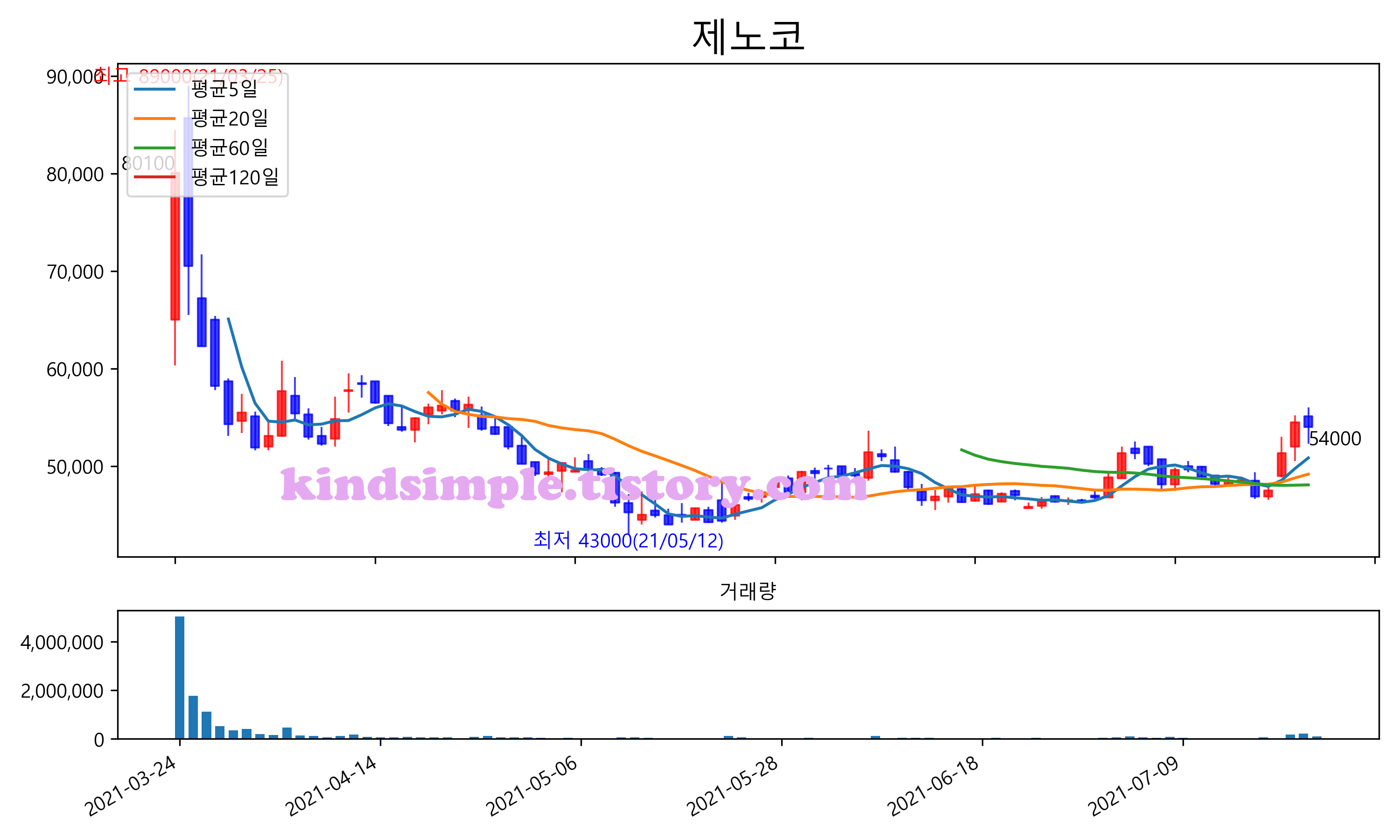 최근 6개월간 캔들차트 및 이동평균선입니다.