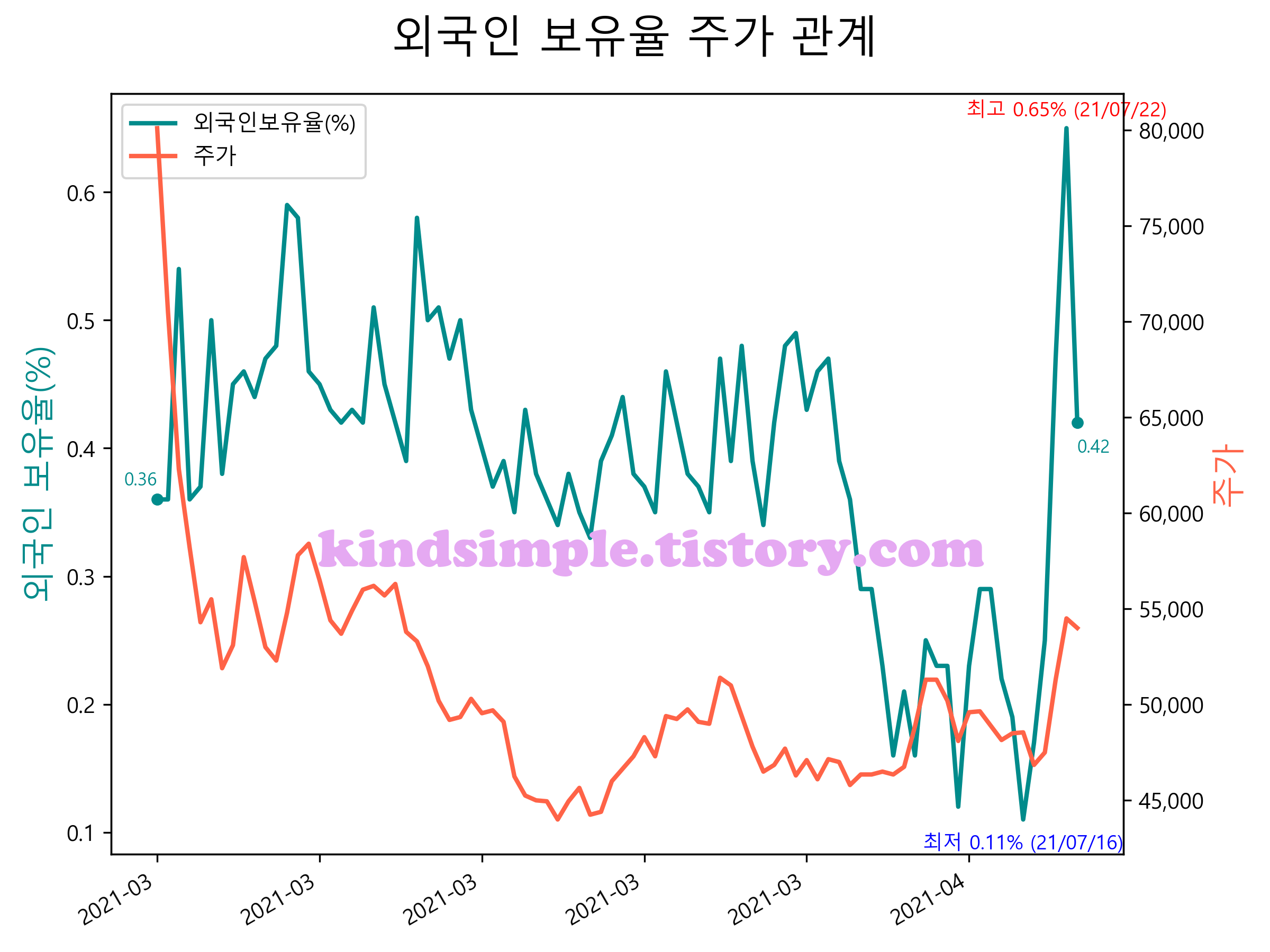 최근 1년간 외국인 보유율 및 주가와의 관계입니다.