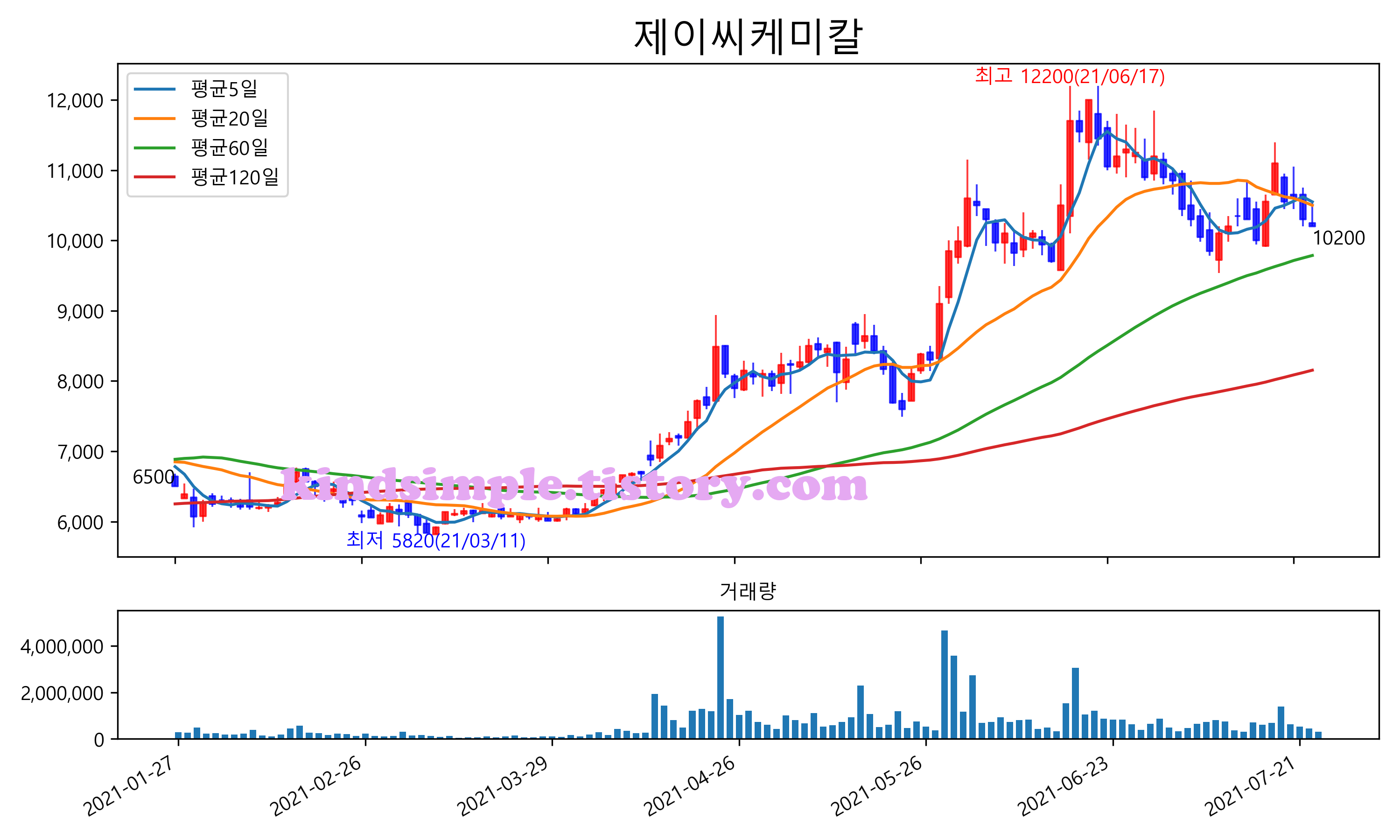 최근 6개월간 캔들차트 및 이동평균선입니다.