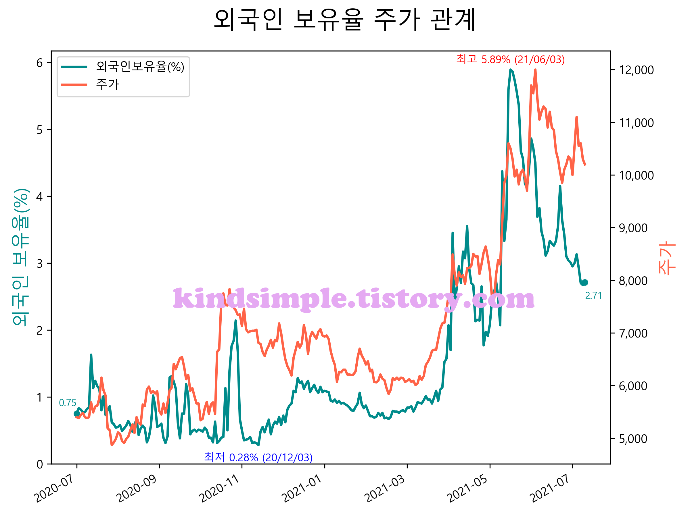 최근 1년간 외국인 보유율 및 주가와의 관계입니다.