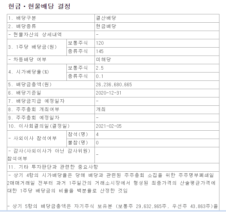 2020년 배당금은 주당 120원 입니다. 작년 배당금과 동일합니다.