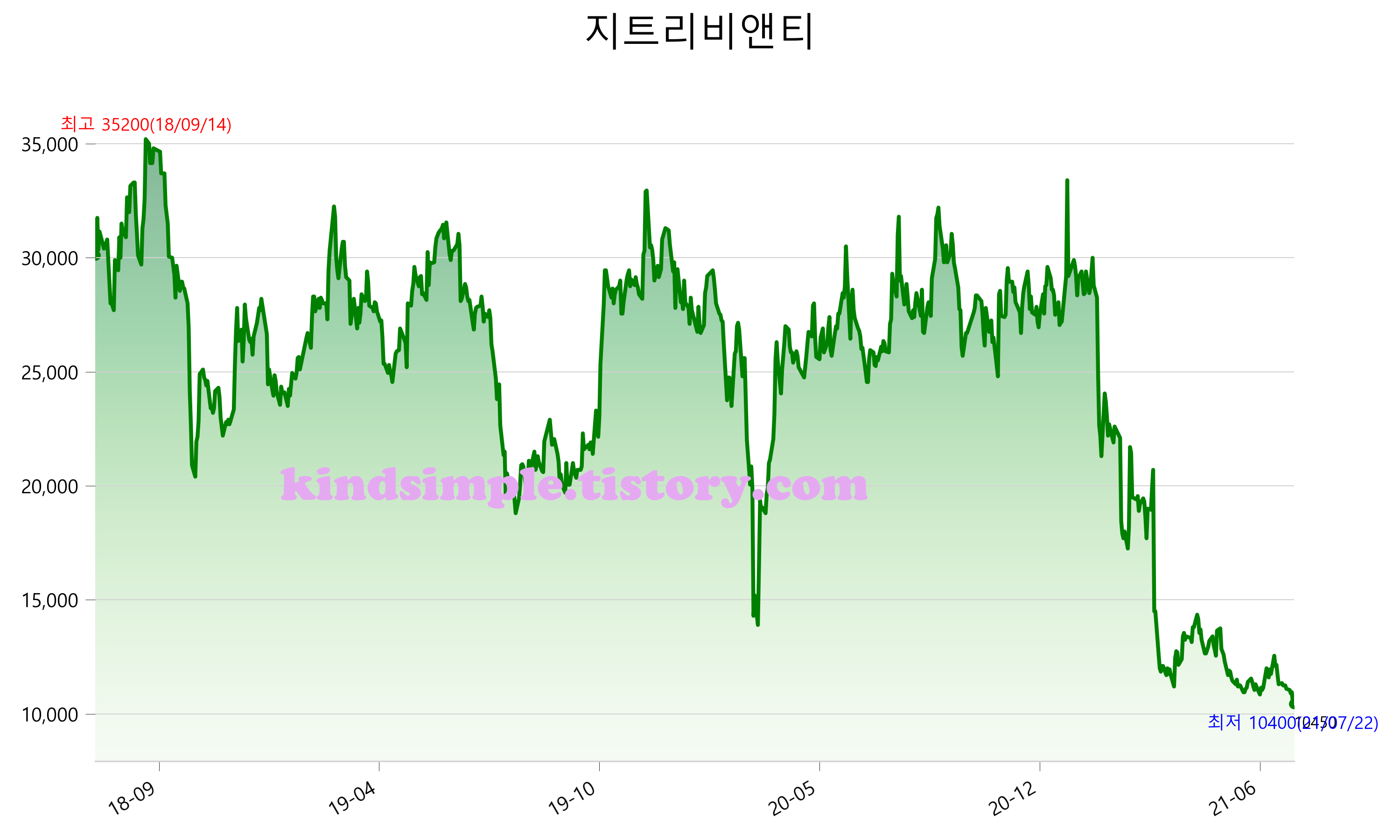 52주 최고가는 33,400원(2020-12-29), 52주 최저가는 10,400원(2021-07-22)으로 52주간 변동률은 -63.1% 입니다.