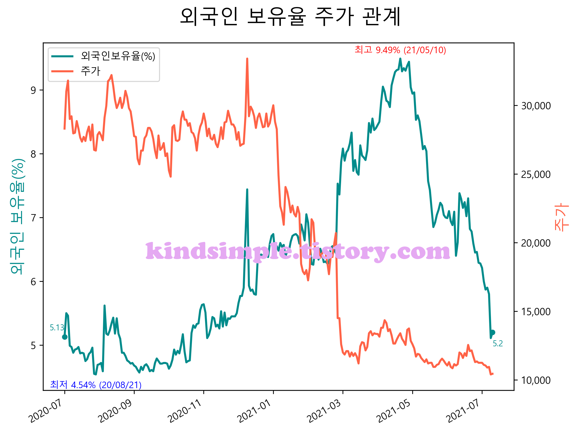 최근 1년간 외국인 보유율 및 주가와의 관계입니다.