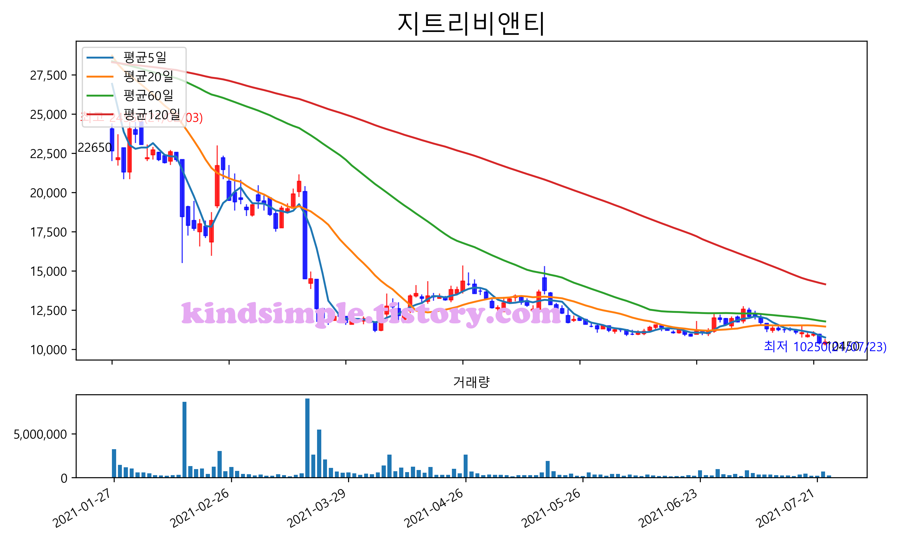 최근 6개월간 캔들차트 및 이동평균선입니다.
