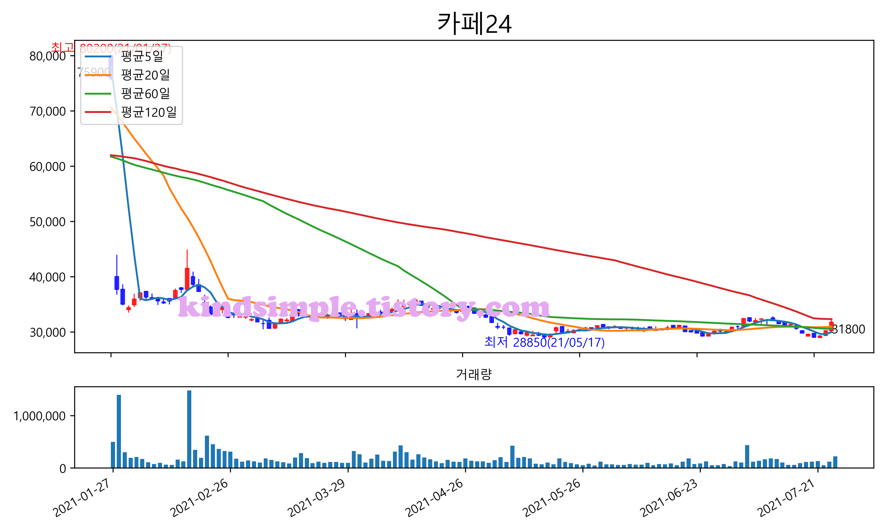 최근 6개월간 캔들차트 및 이동평균선입니다.
