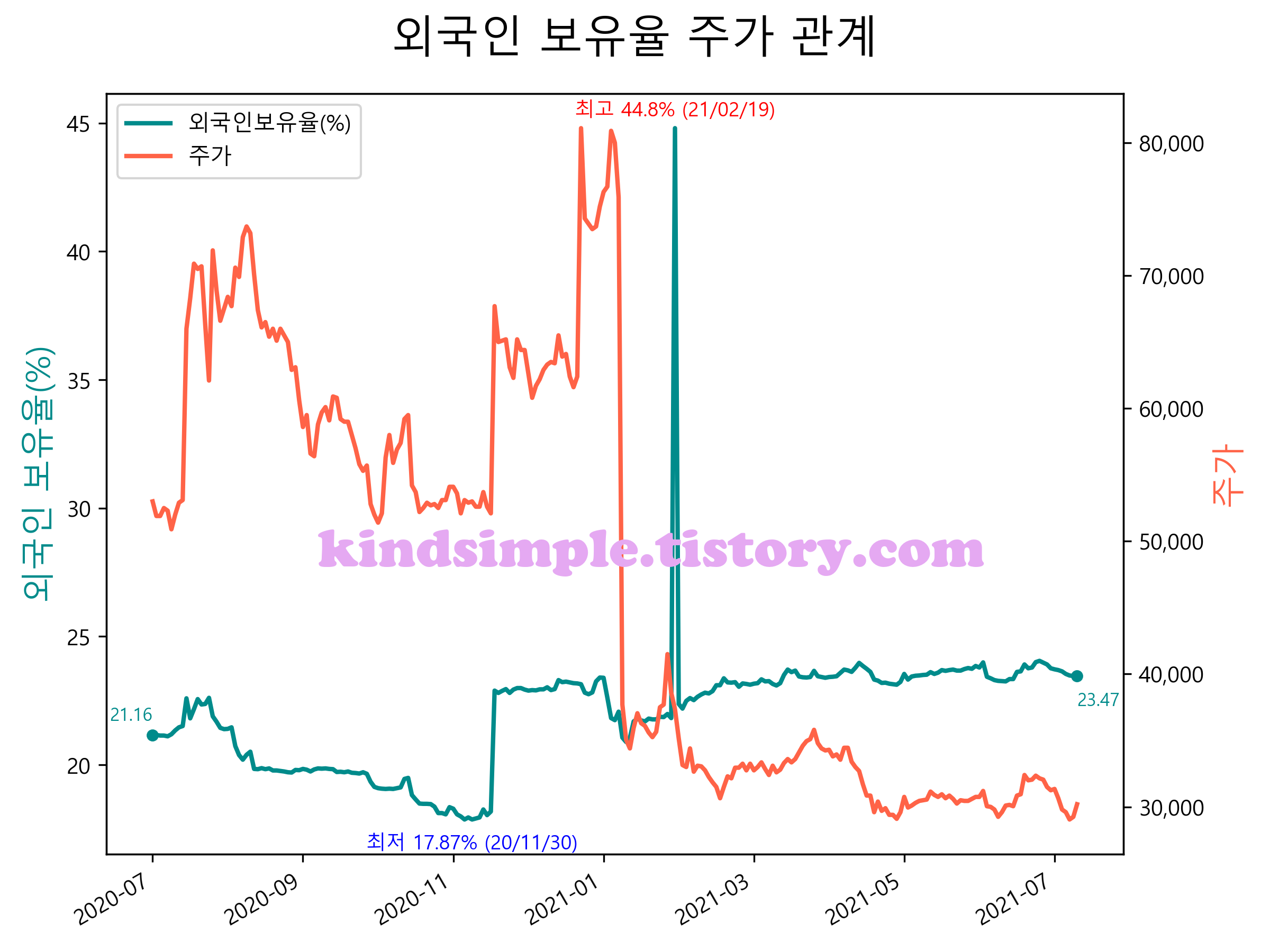 최근 1년간 외국인 보유율 및 주가와의 관계입니다.