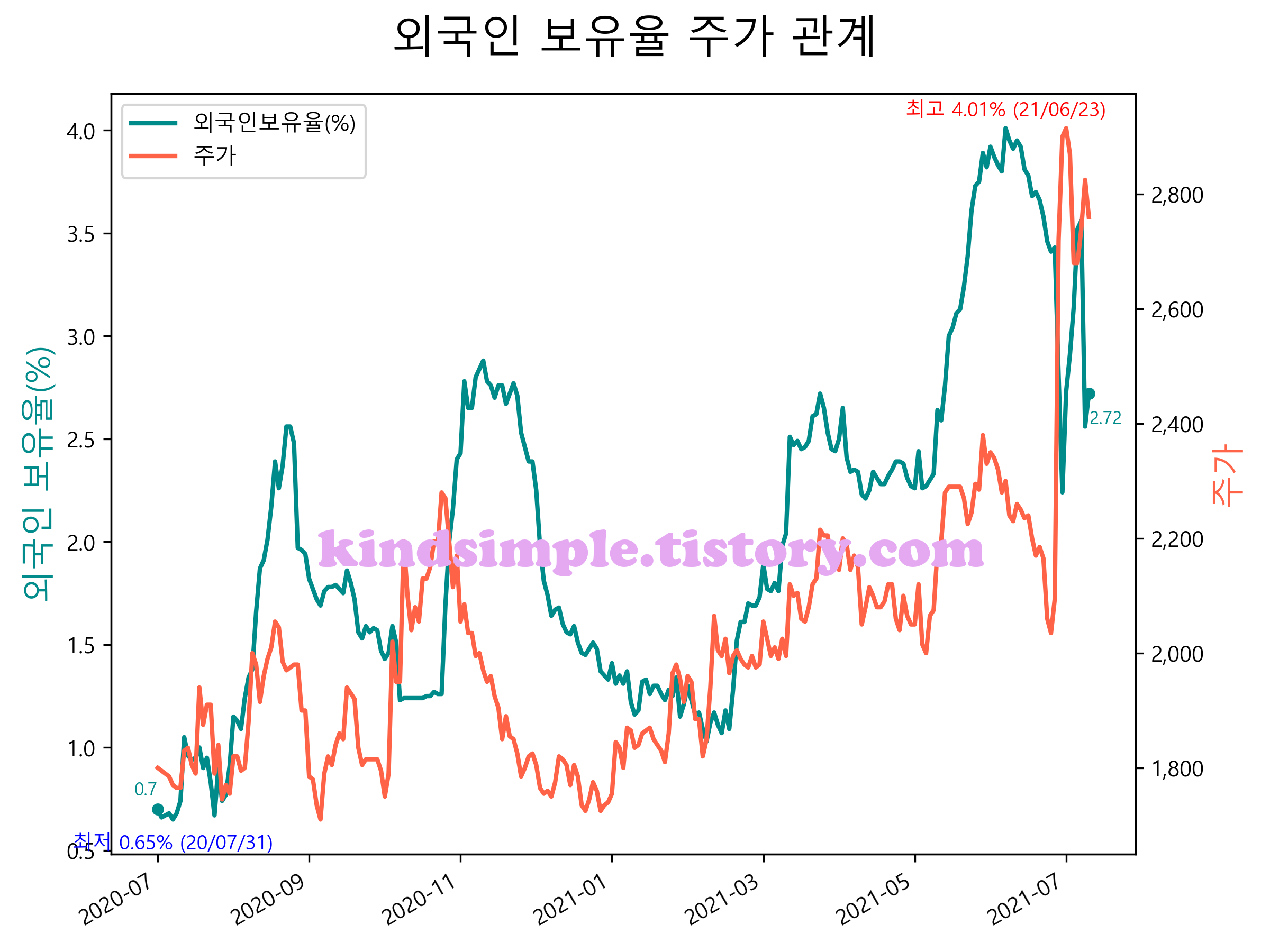 최근 1년간 외국인 보유율 및 주가와의 관계입니다.