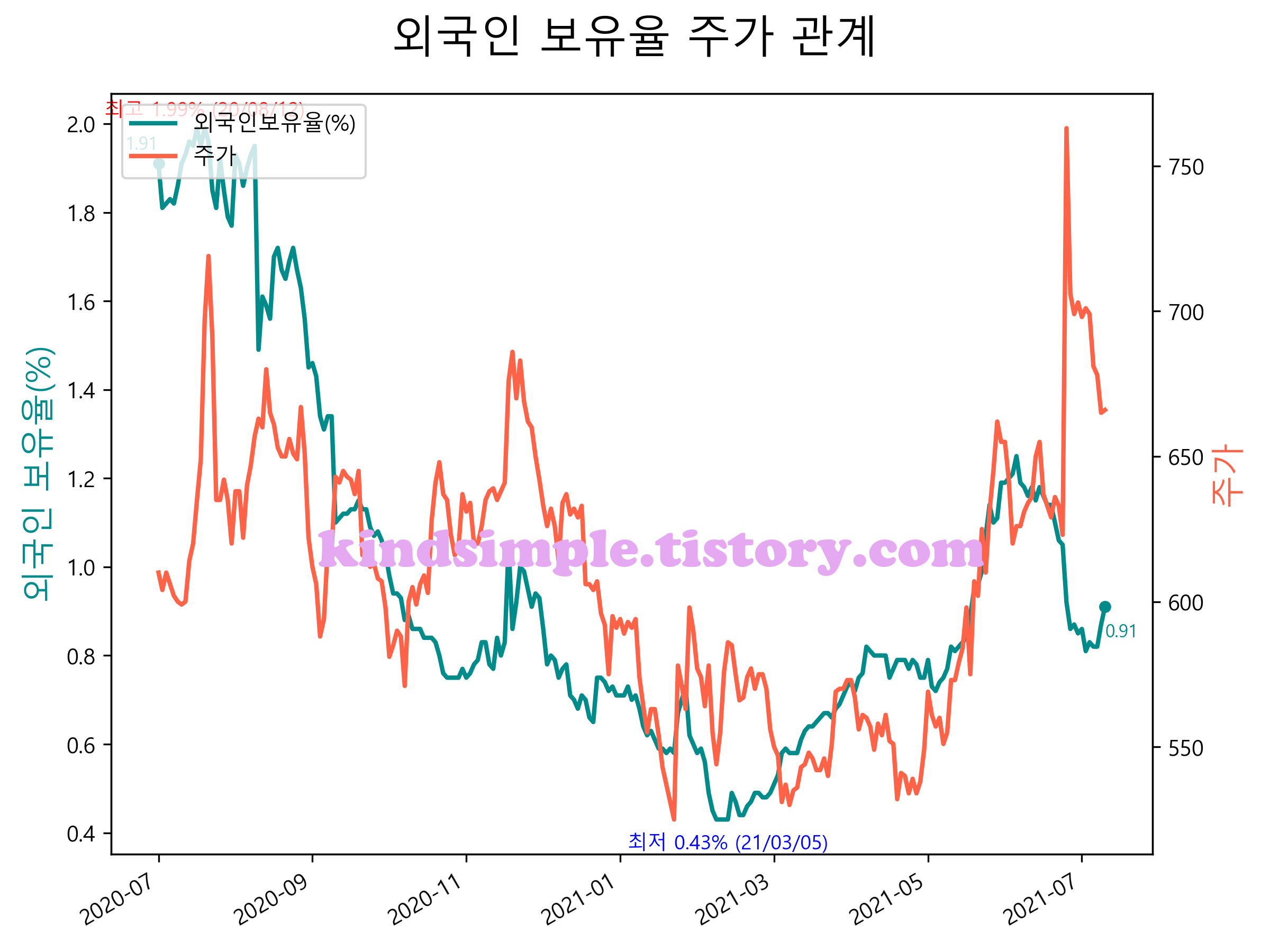 최근 1년간 외국인 보유율 및 주가와의 관계입니다.