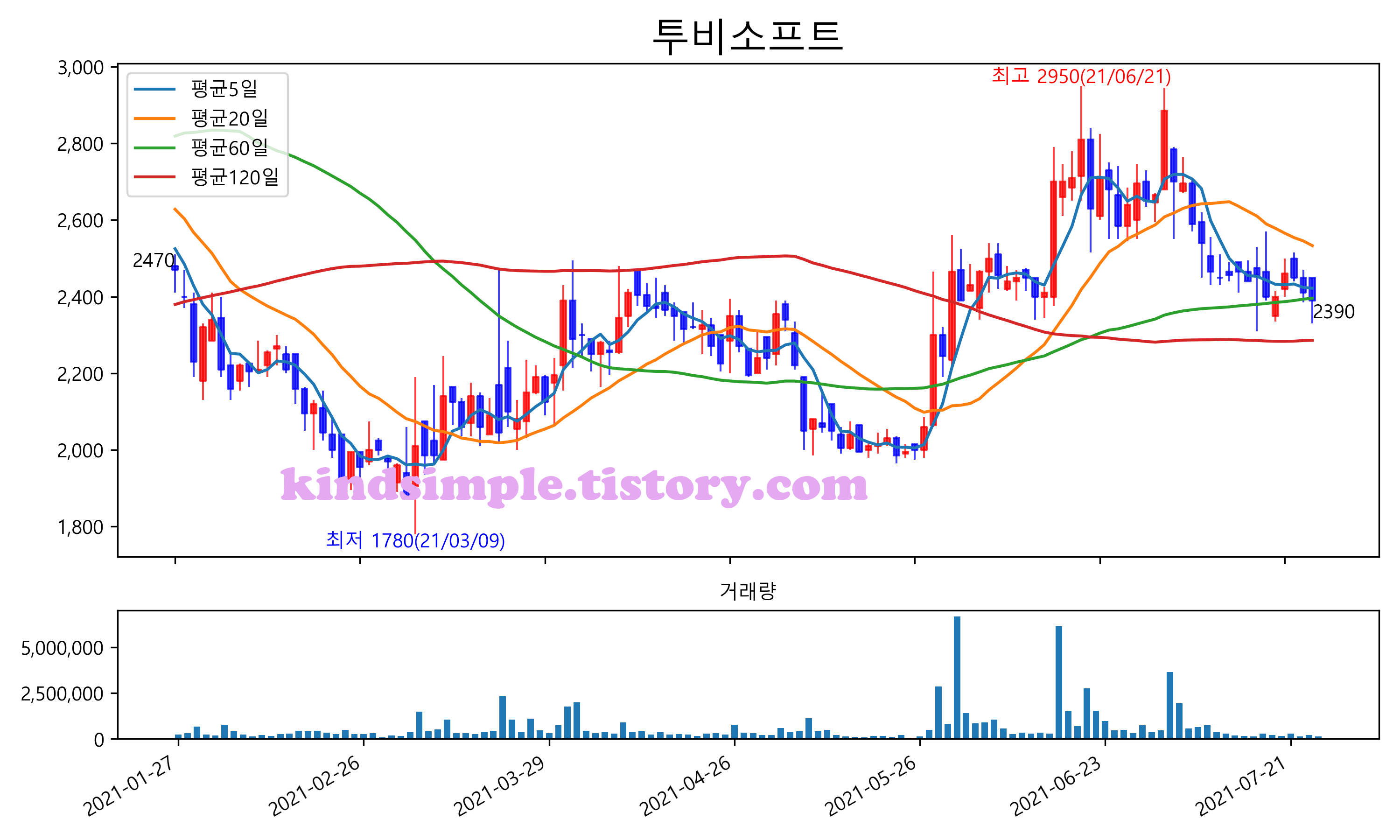최근 6개월간 캔들차트 및 이동평균선입니다.