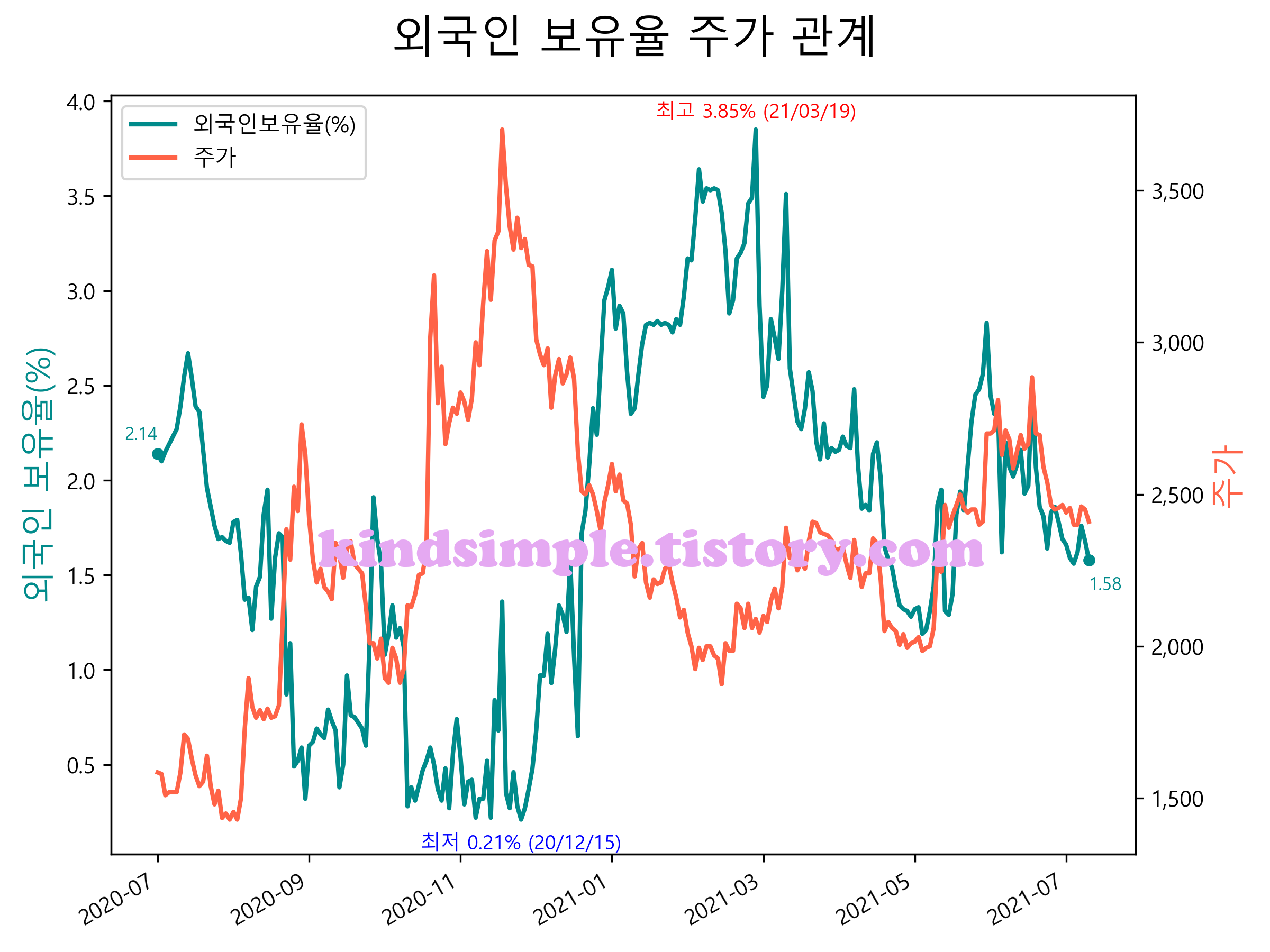 최근 1년간 외국인 보유율 및 주가와의 관계입니다.