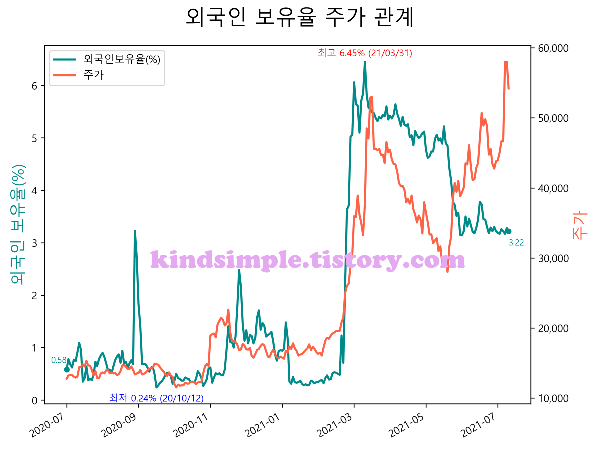 최근 1년간 외국인 보유율 및 주가와의 관계입니다.