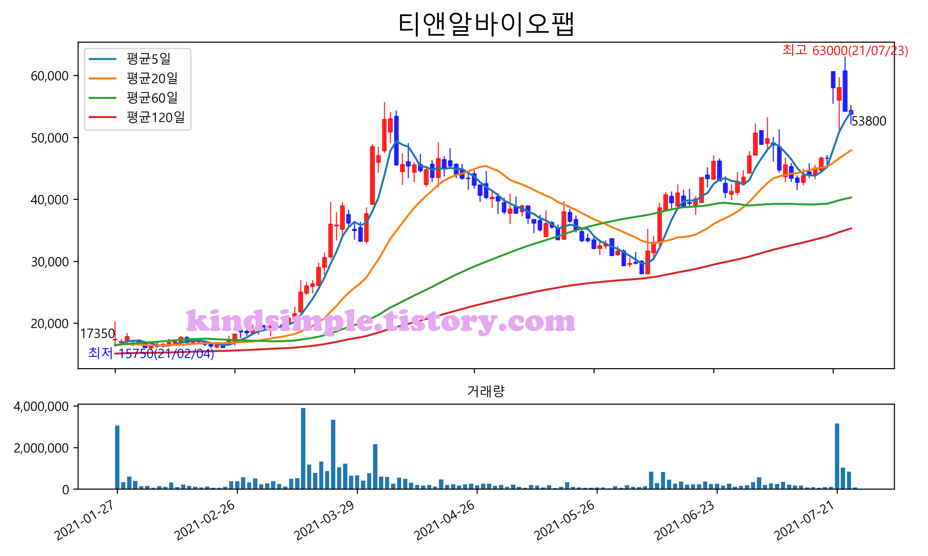 최근 6개월간 캔들차트 및 이동평균선입니다.