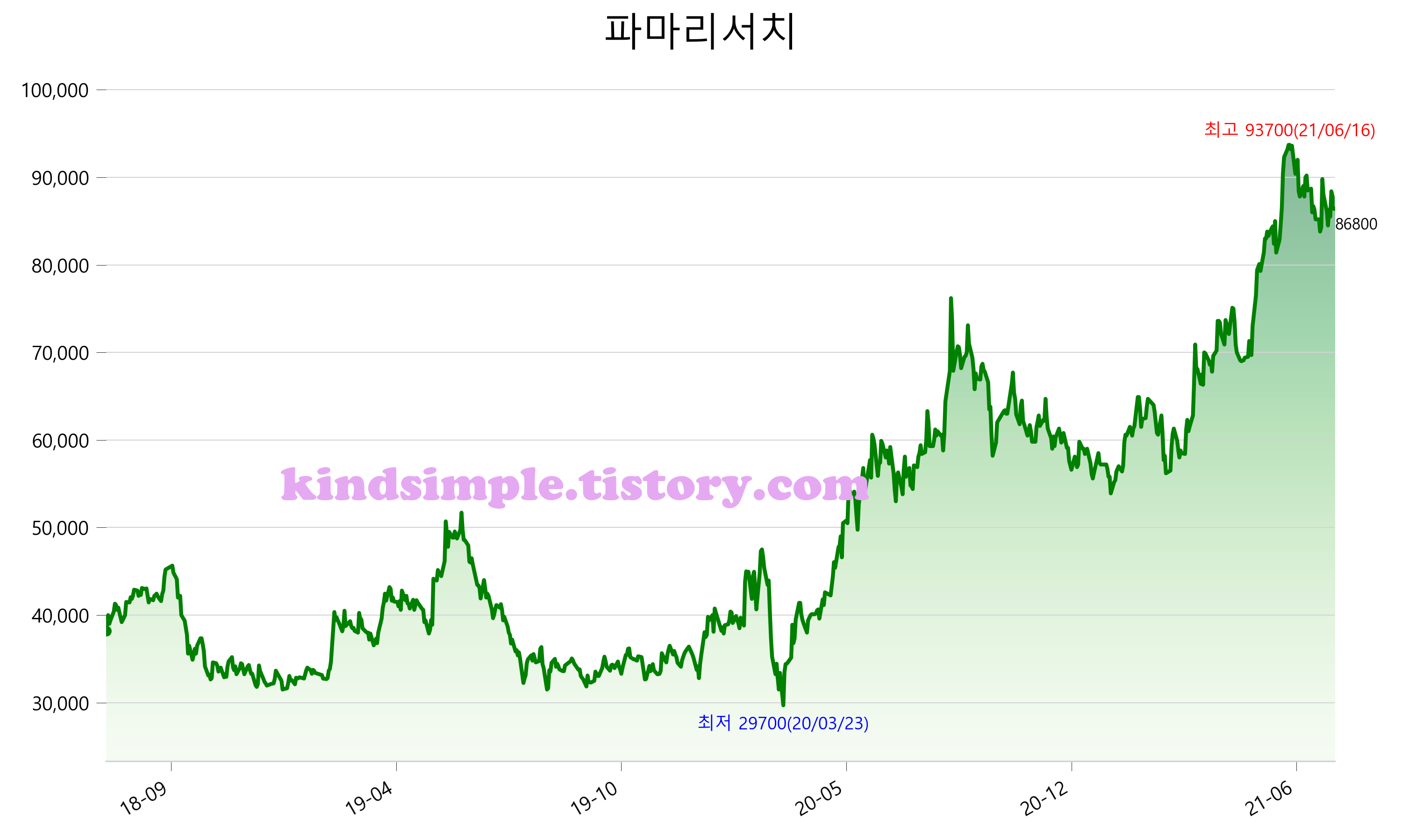 7월 26일 기준 주가는 86,800원 입니다. 아래는 최근 3년간의 주가흐름입니다.
