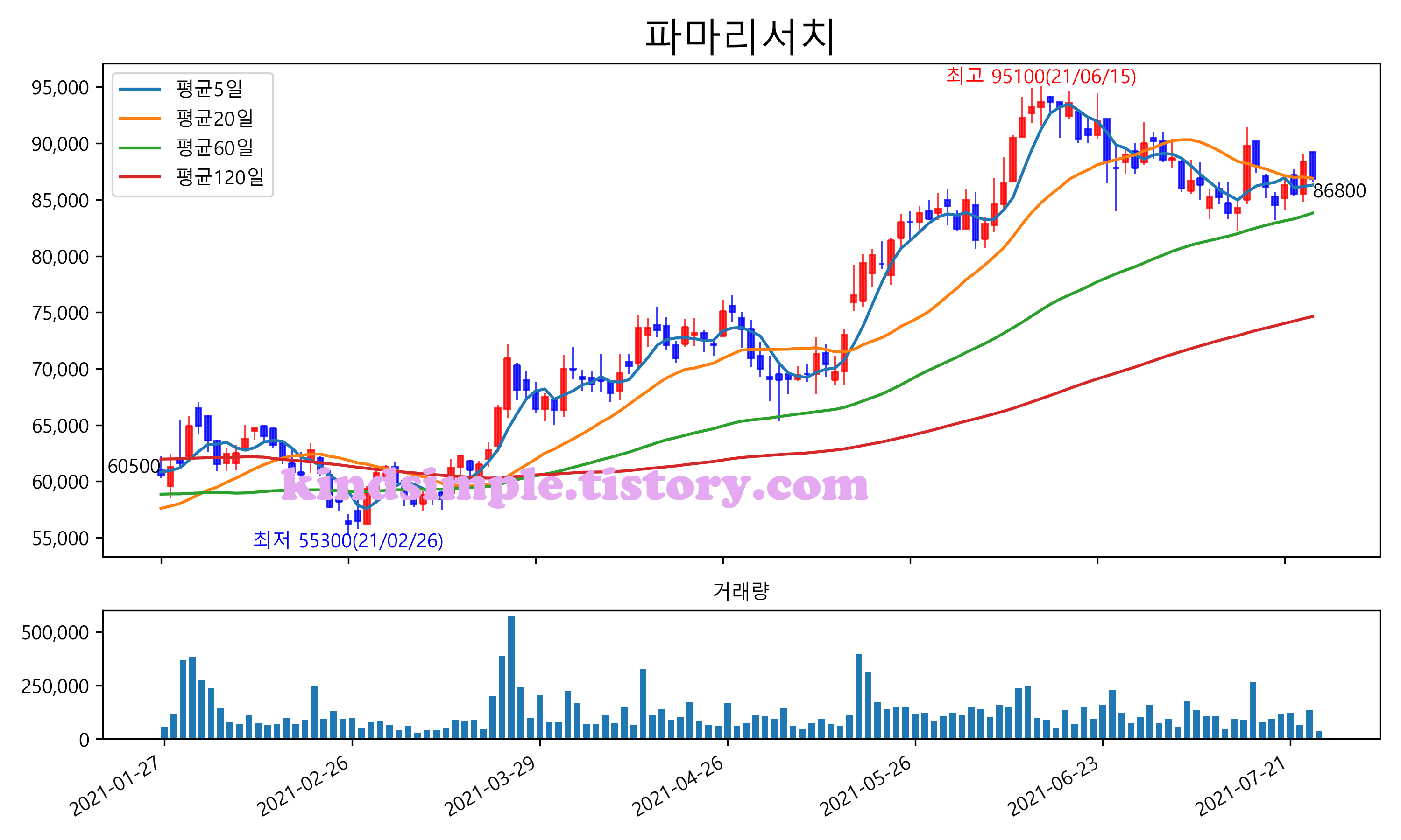 최근 6개월간 캔들차트 및 이동평균선입니다.