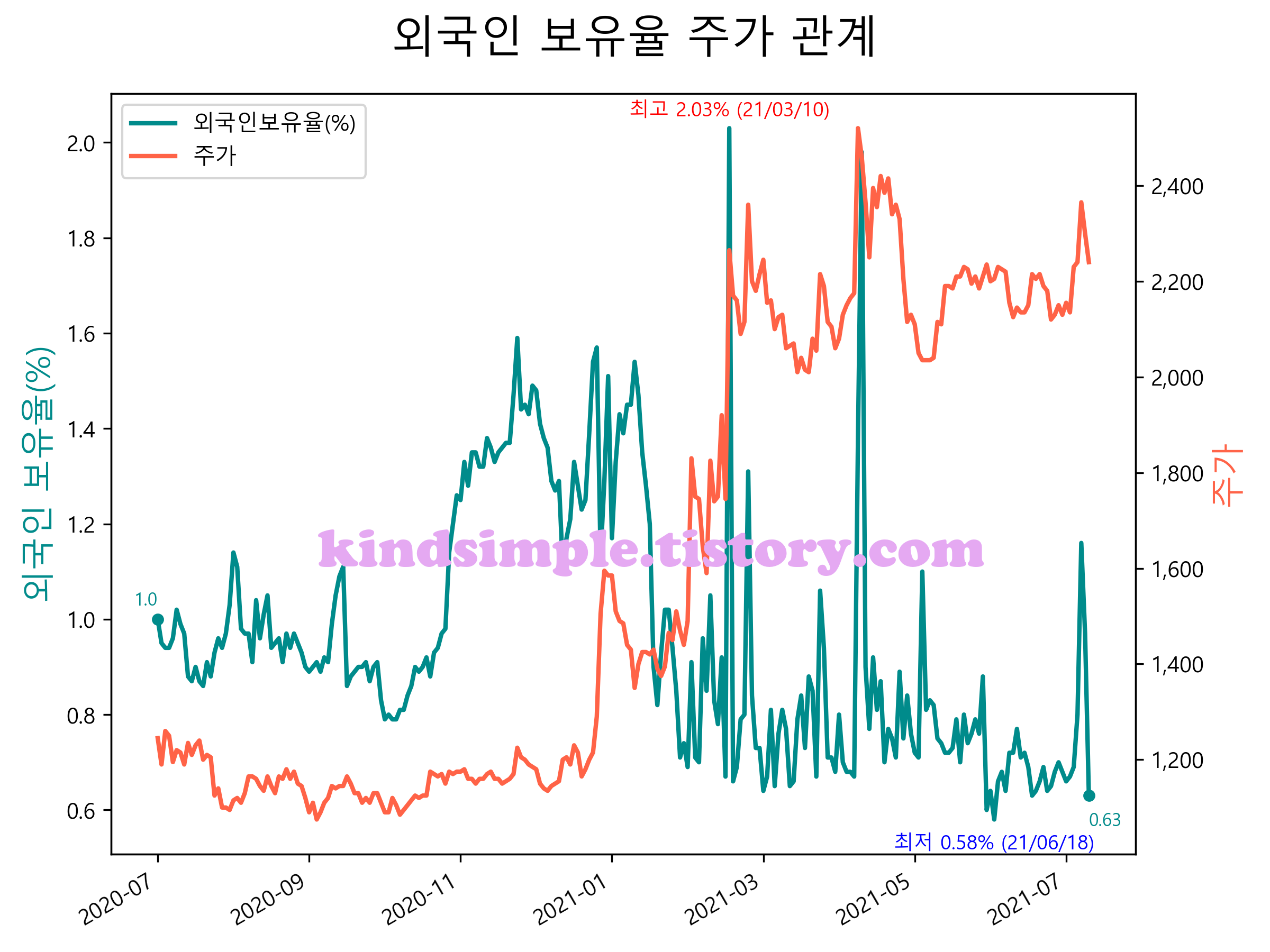 최근 1년간 외국인 보유율 및 주가와의 관계입니다.