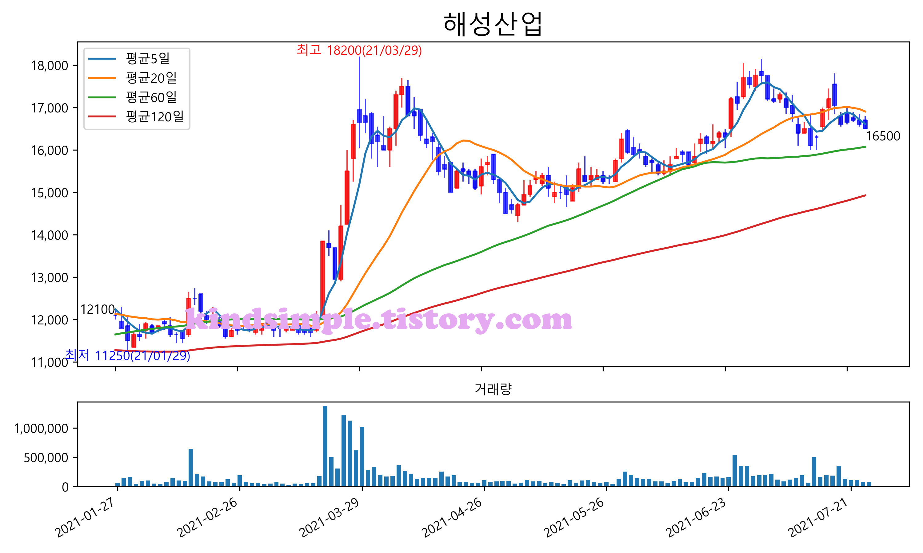최근 6개월간 캔들차트 및 이동평균선입니다.