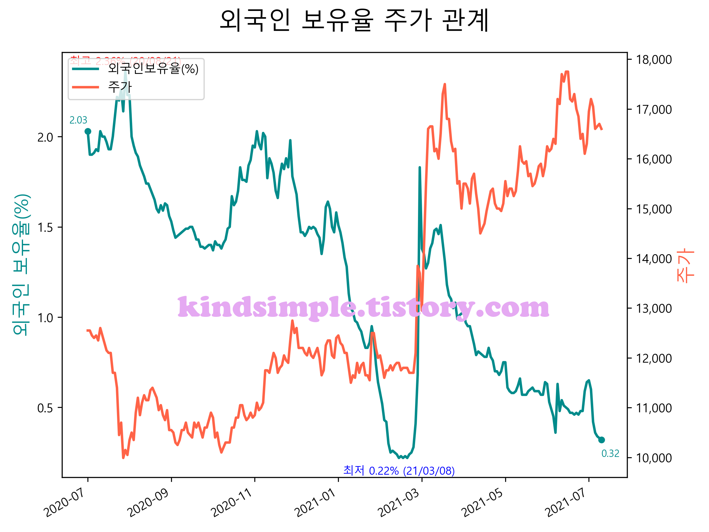 최근 1년간 외국인 보유율 및 주가와의 관계입니다.