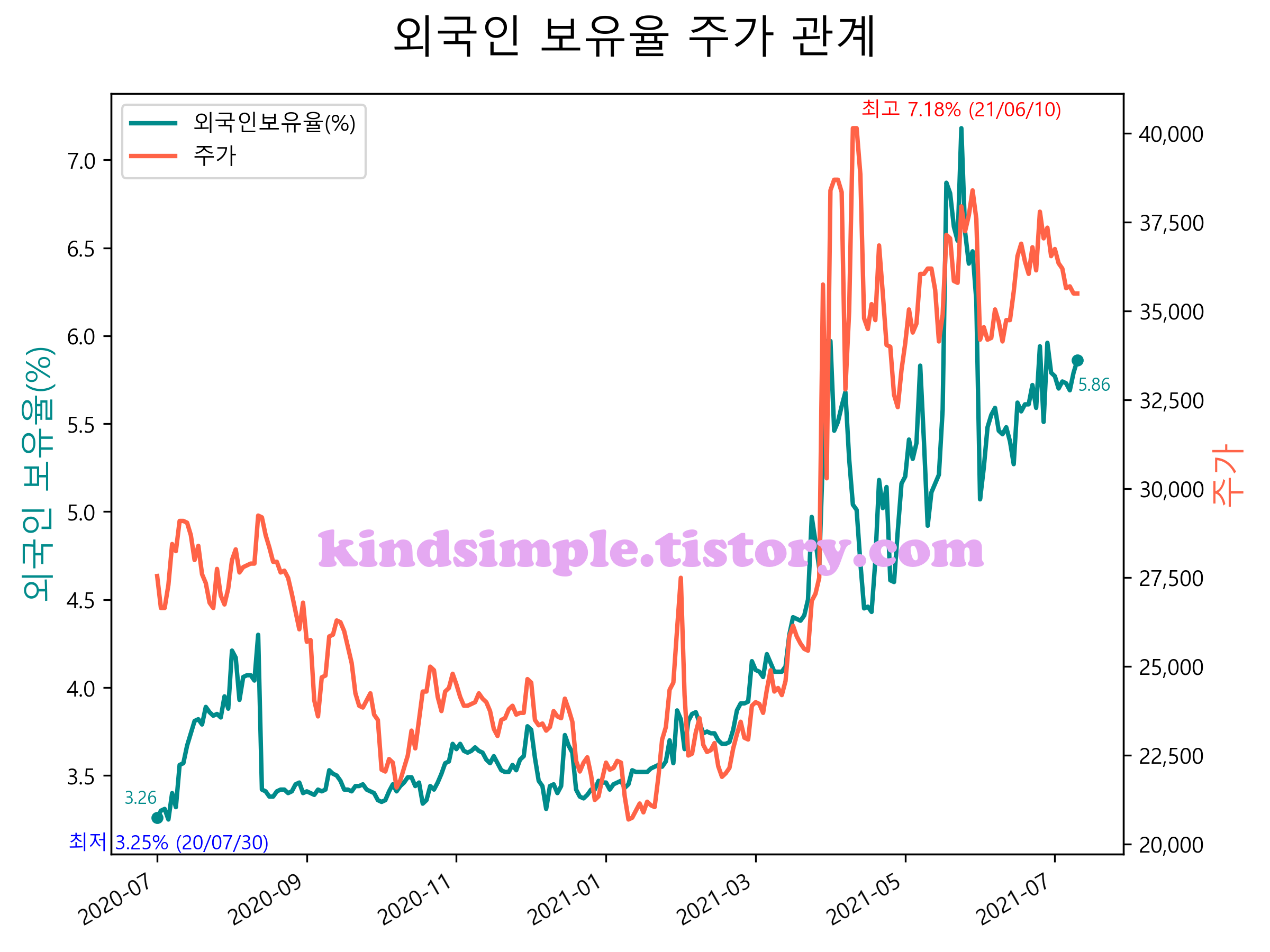 최근 1년간 외국인 보유율 및 주가와의 관계입니다.