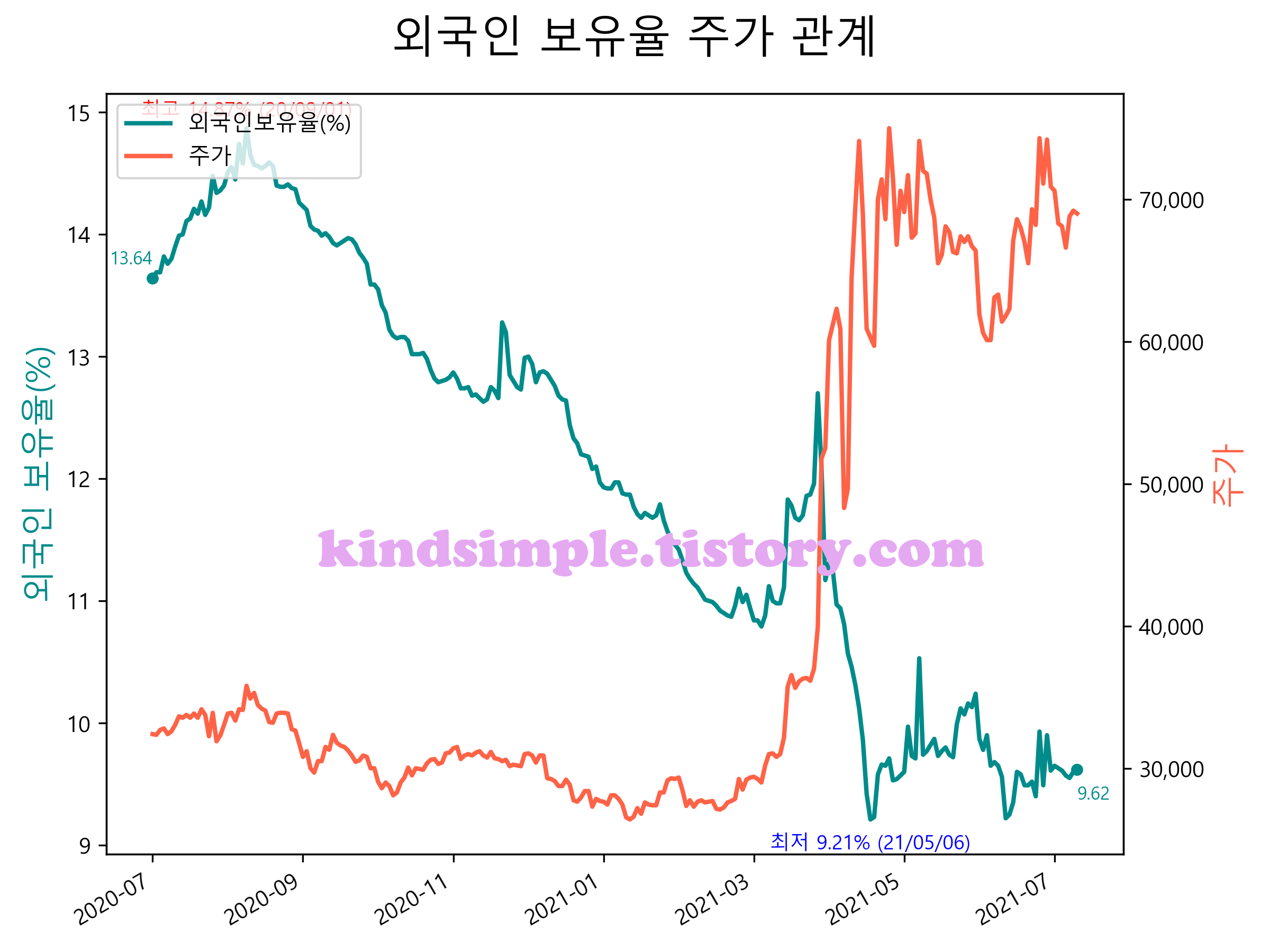 최근 1년간 외국인 보유율 및 주가와의 관계입니다.