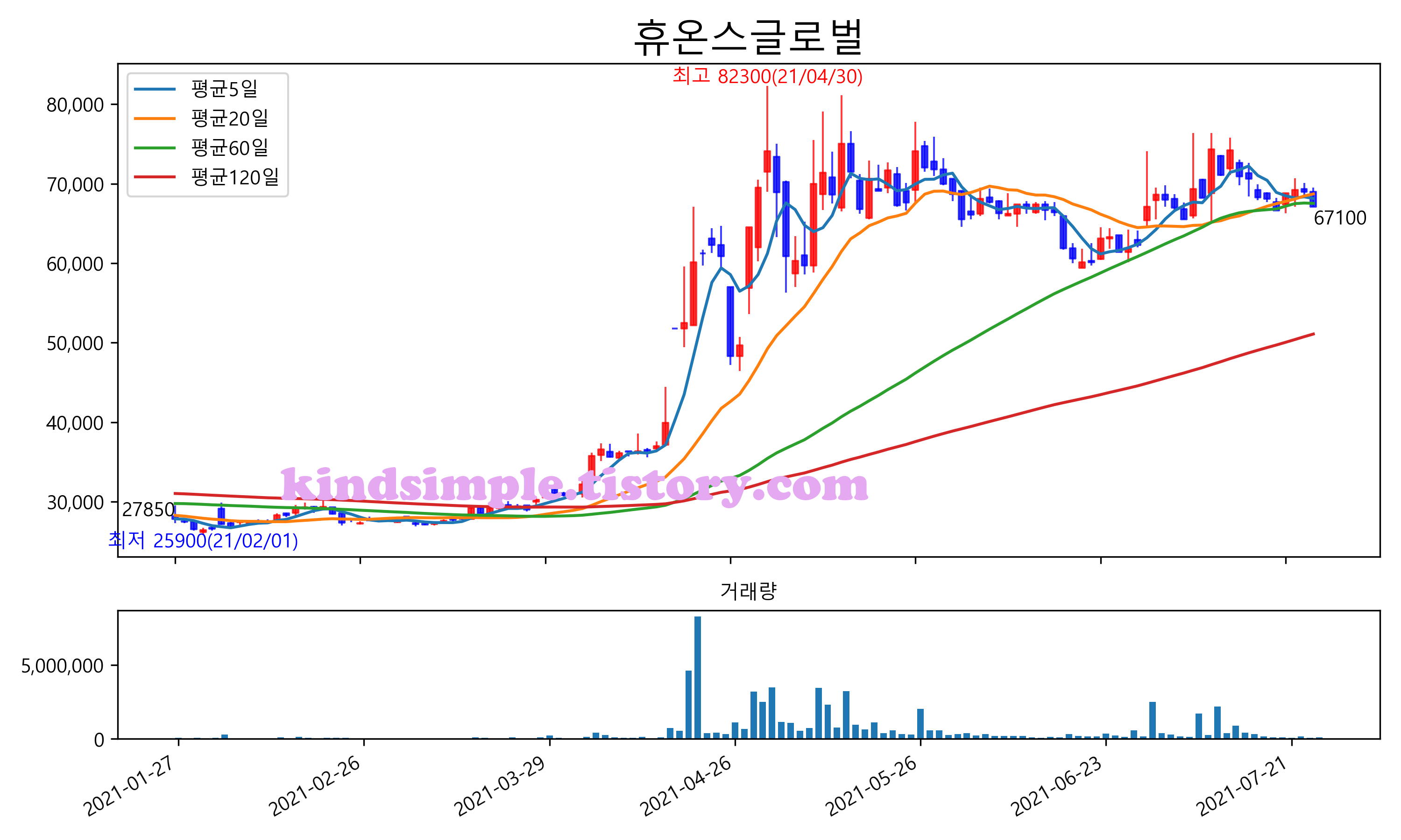 최근 6개월간 캔들차트 및 이동평균선입니다.