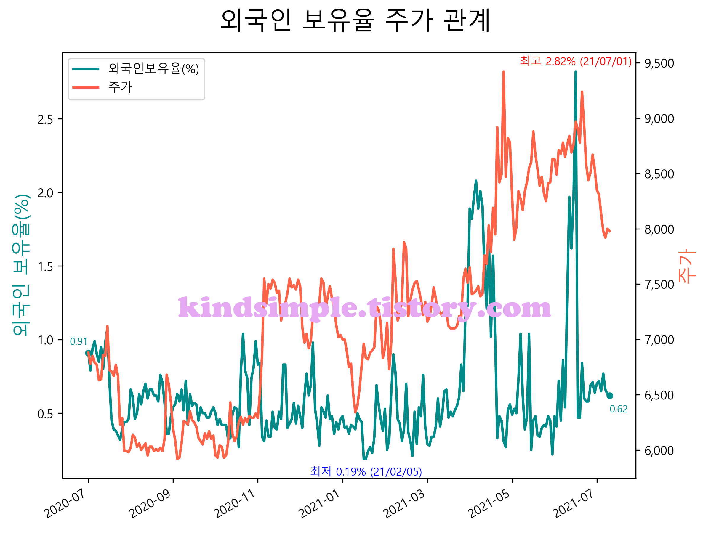 최근 1년간 외국인 보유율 및 주가와의 관계입니다.