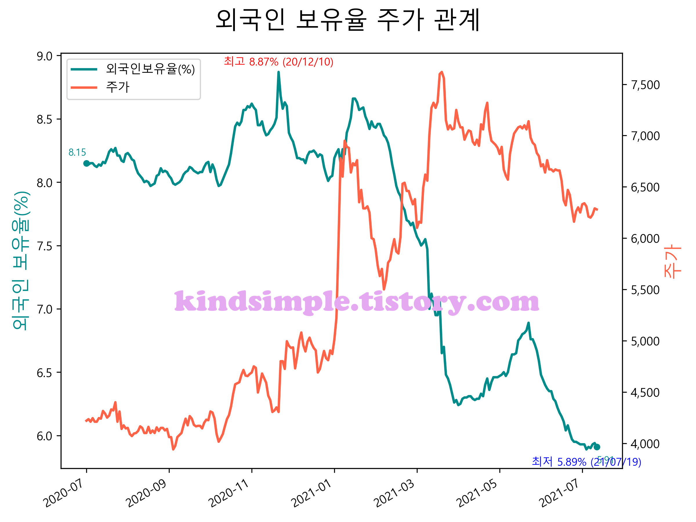 최근 1년간 외국인 보유율 및 주가와의 관계입니다.