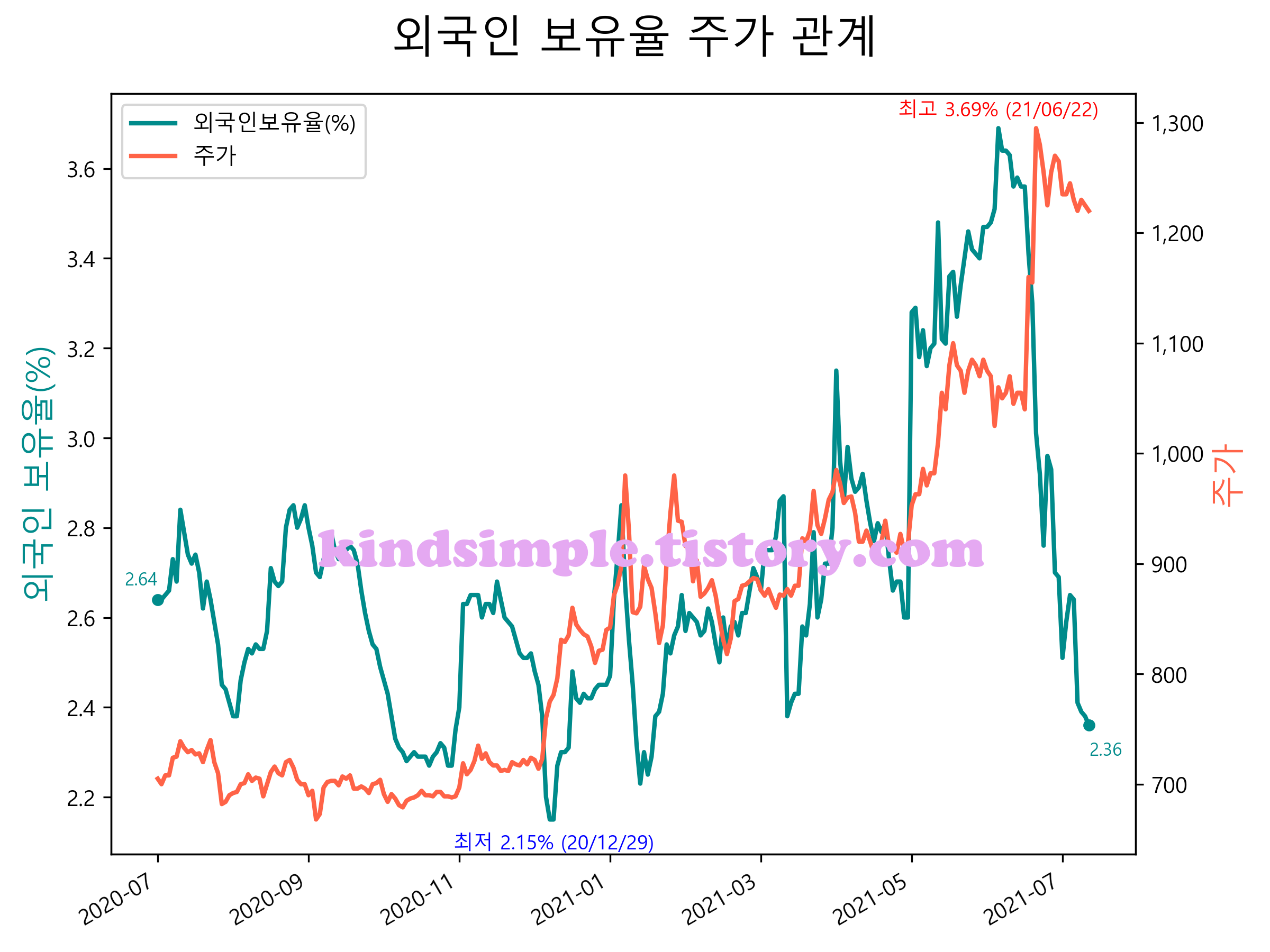 최근 1년간 외국인 보유율 및 주가와의 관계입니다.