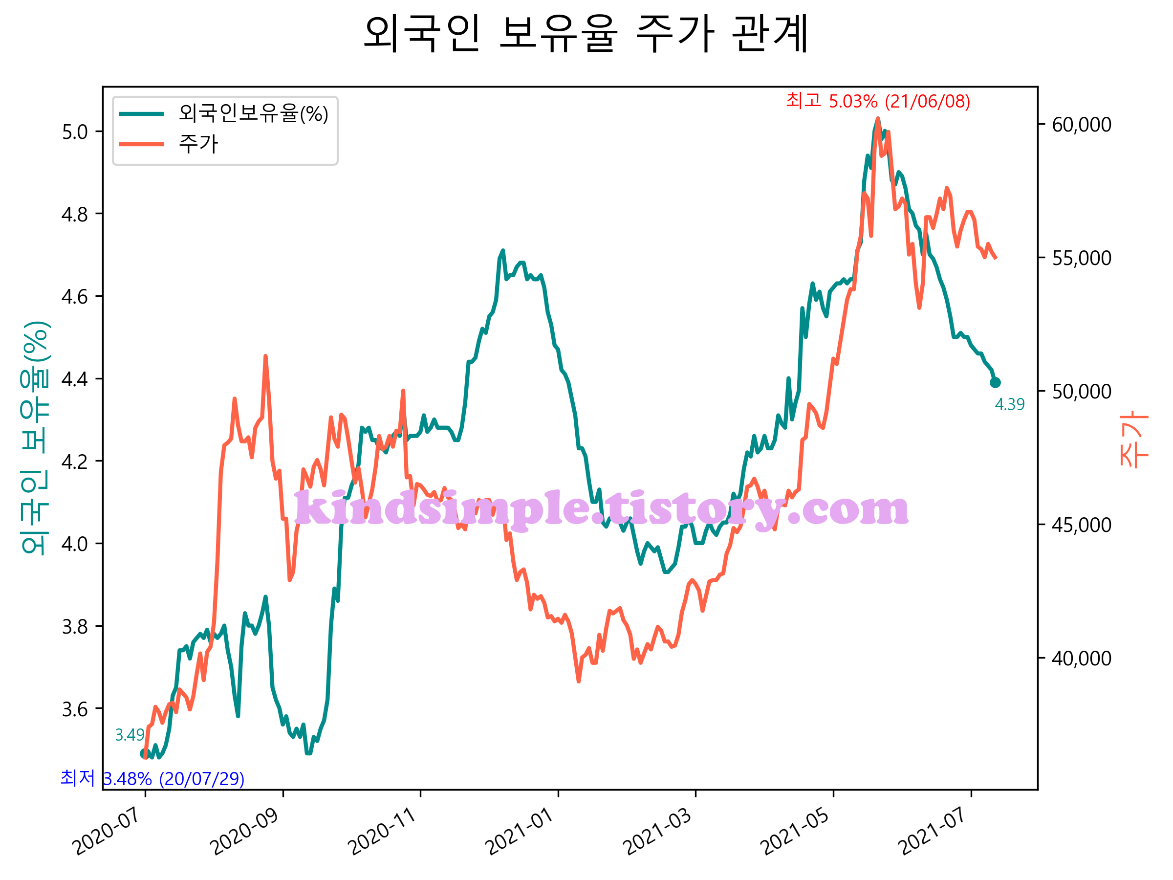 최근 1년간 외국인 보유율 및 주가와의 관계입니다.
