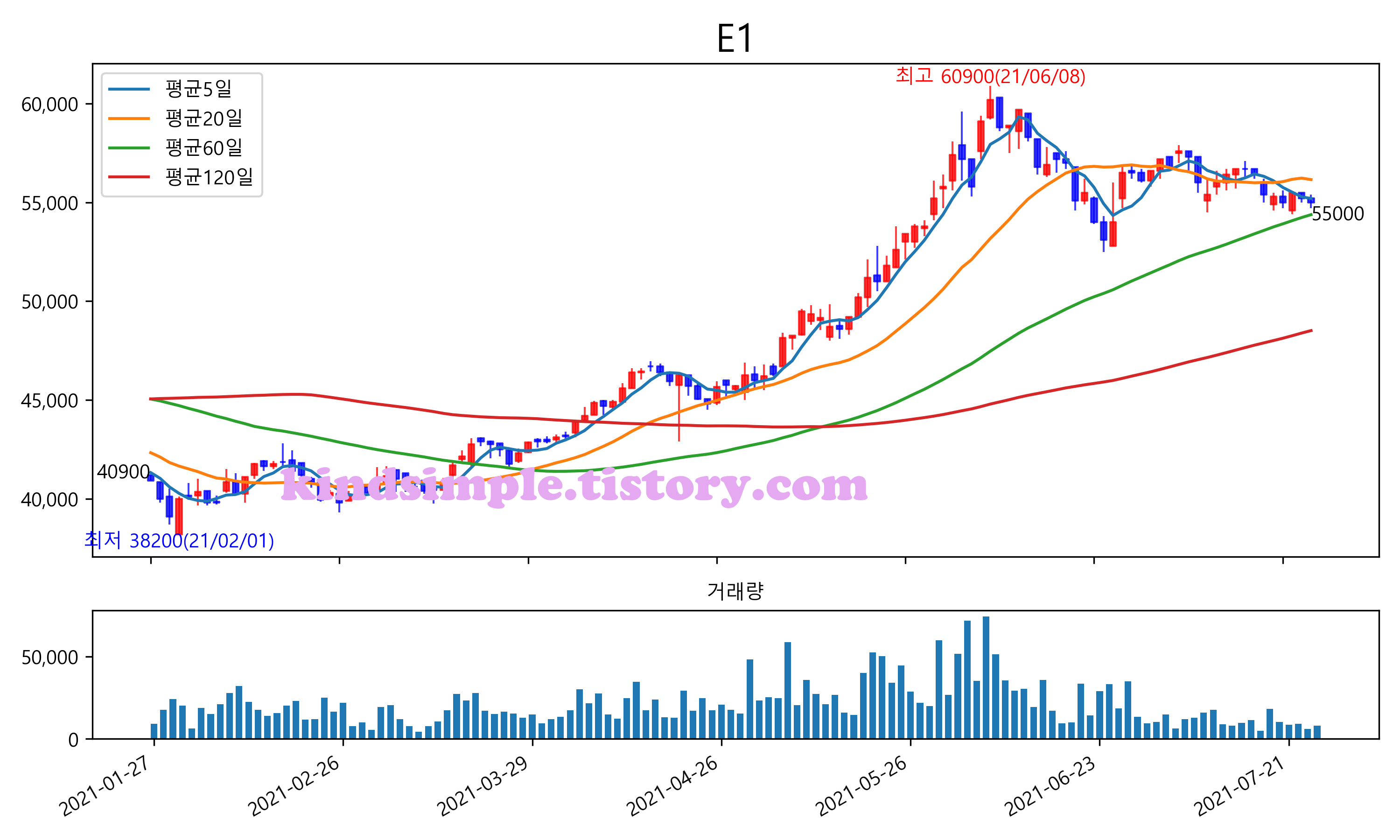 E1의 최근 5년간 실적입니다. 2020년 매출은 3조 9276억원, 영업이익 395억원, 당기순이익 563억원을 기록했습니다. 연간 매출 및 영업이익, 당기순이익 표입니다.