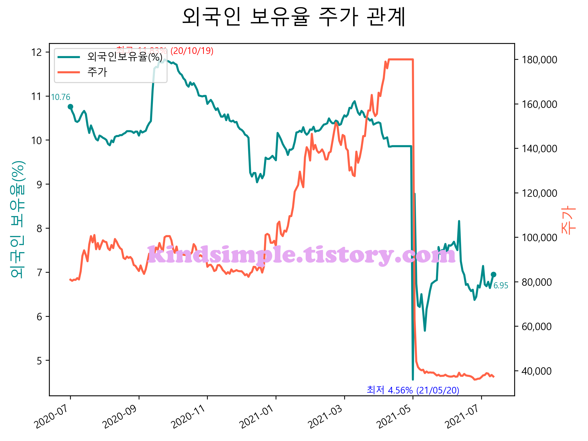 최근 1년간 외국인 보유율 및 주가와의 관계입니다.