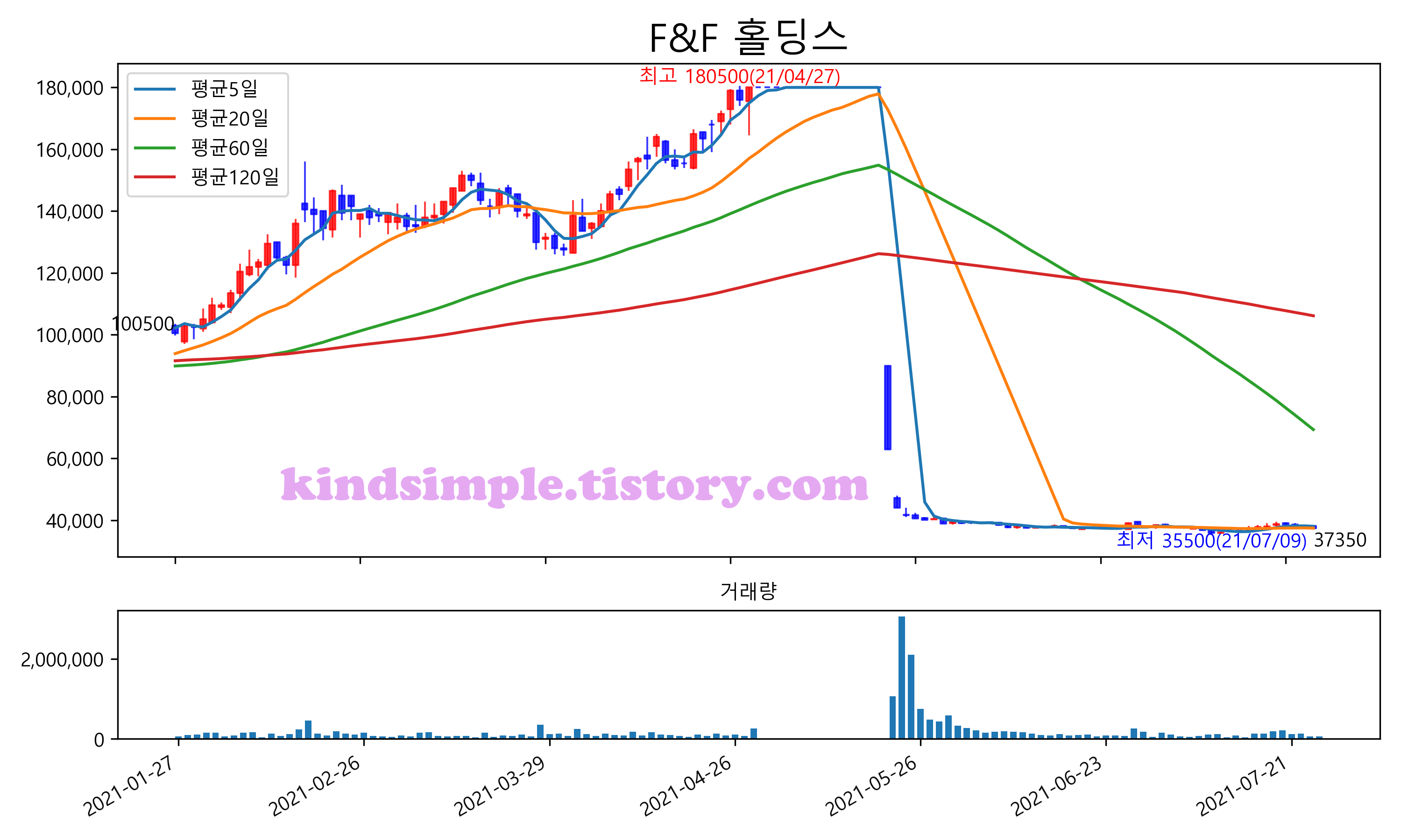 52주 최고가는 180,000원(2021-05-13), 52주 최저가는 35,950원(2021-07-09)으로 52주간 변동률은 -53.8% 입니다.