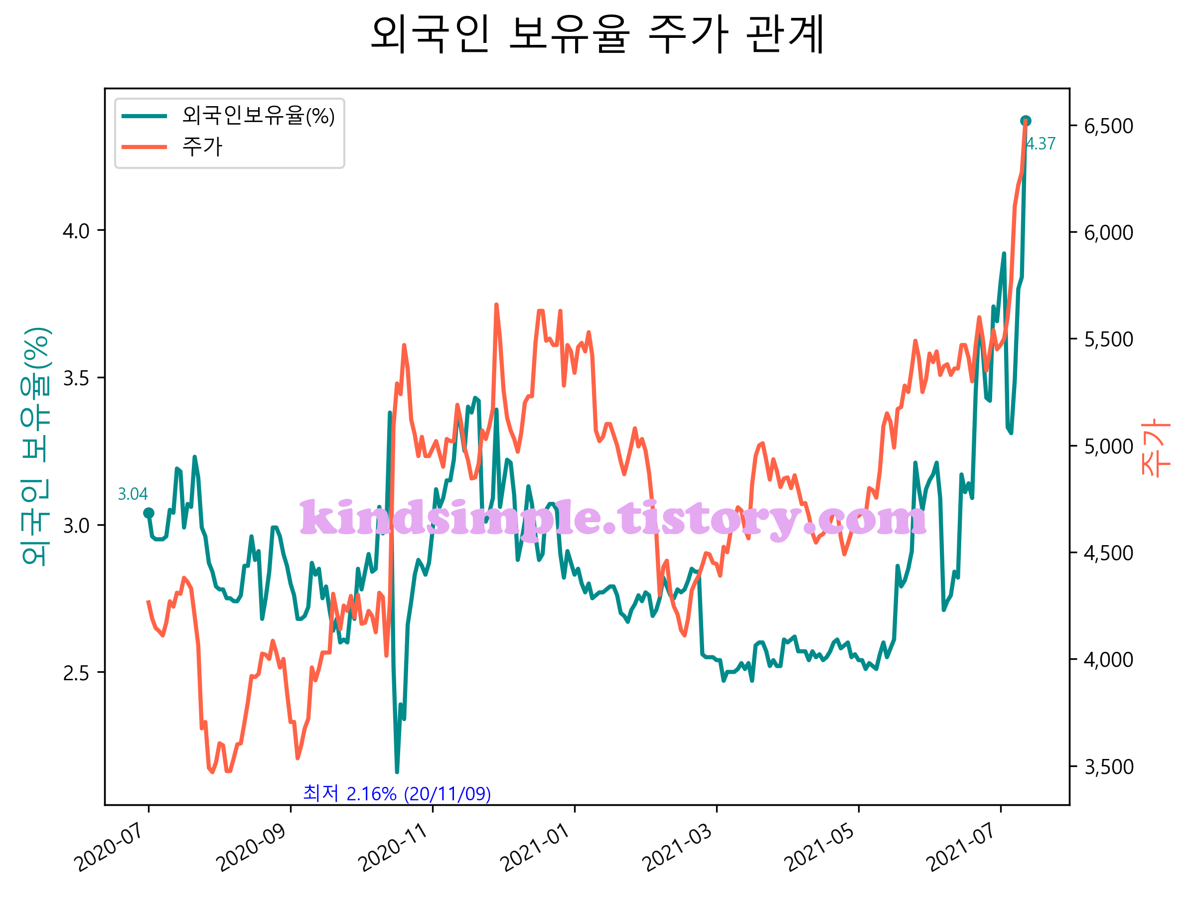 최근 1년간 외국인 보유율 및 주가와의 관계입니다.