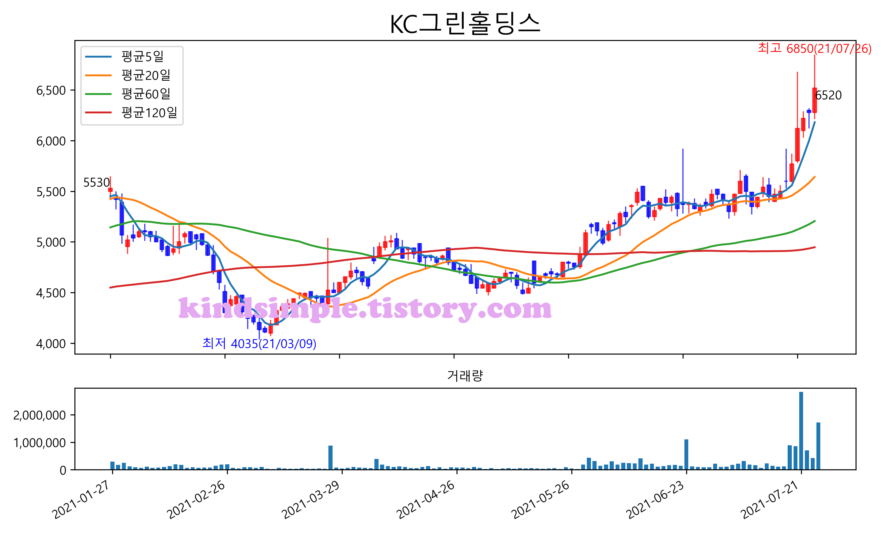 최근 6개월간 캔들차트 및 이동평균선입니다.