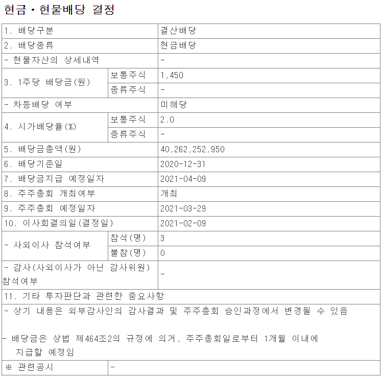 보통주는 1,450원이 배당되며, 시가배당율은 2.0% 입니다. 배당금 총액은 402억원 규모입니다.
