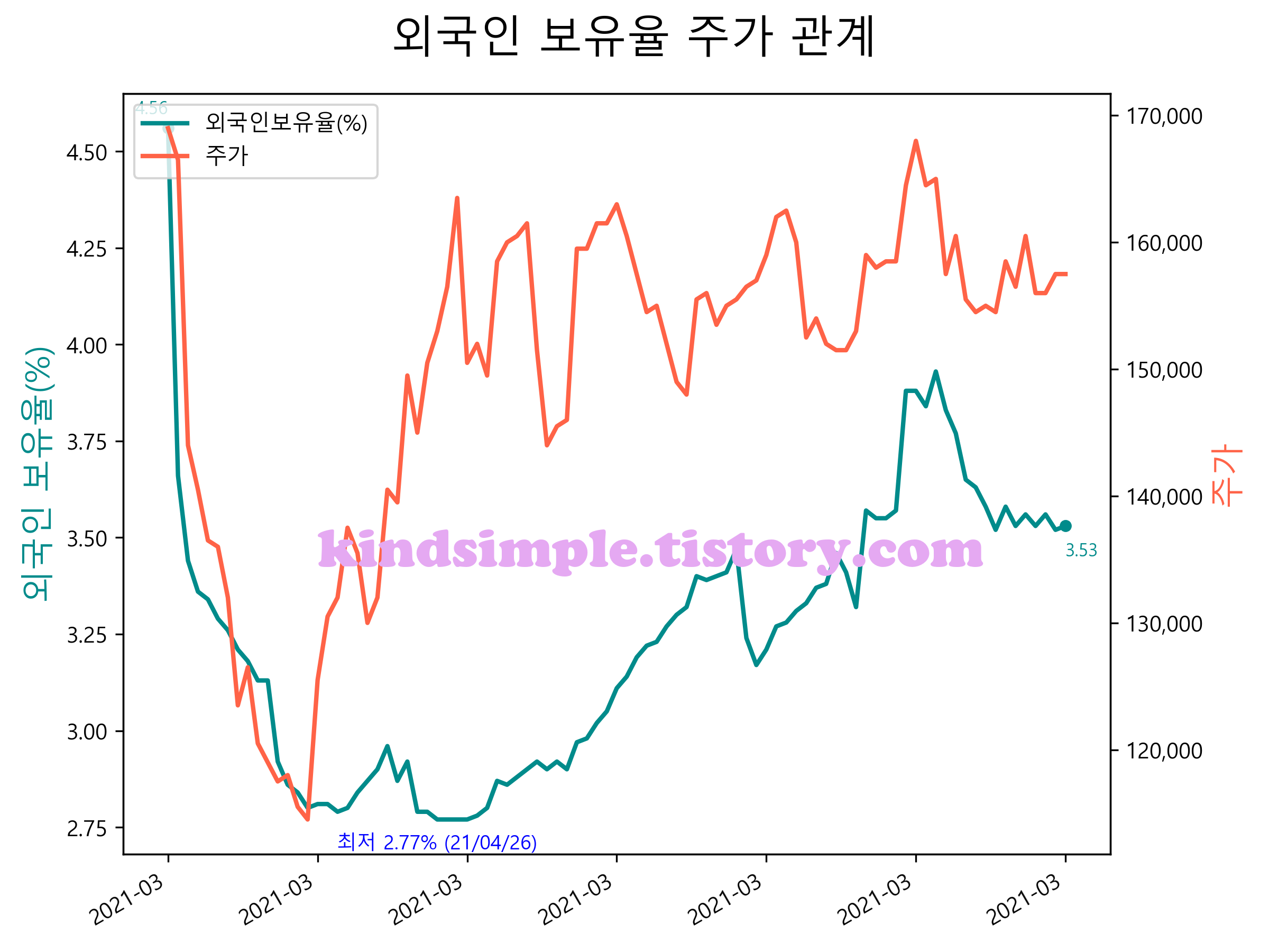 최근 1년간 외국인 보유율 및 주가와의 관계입니다.