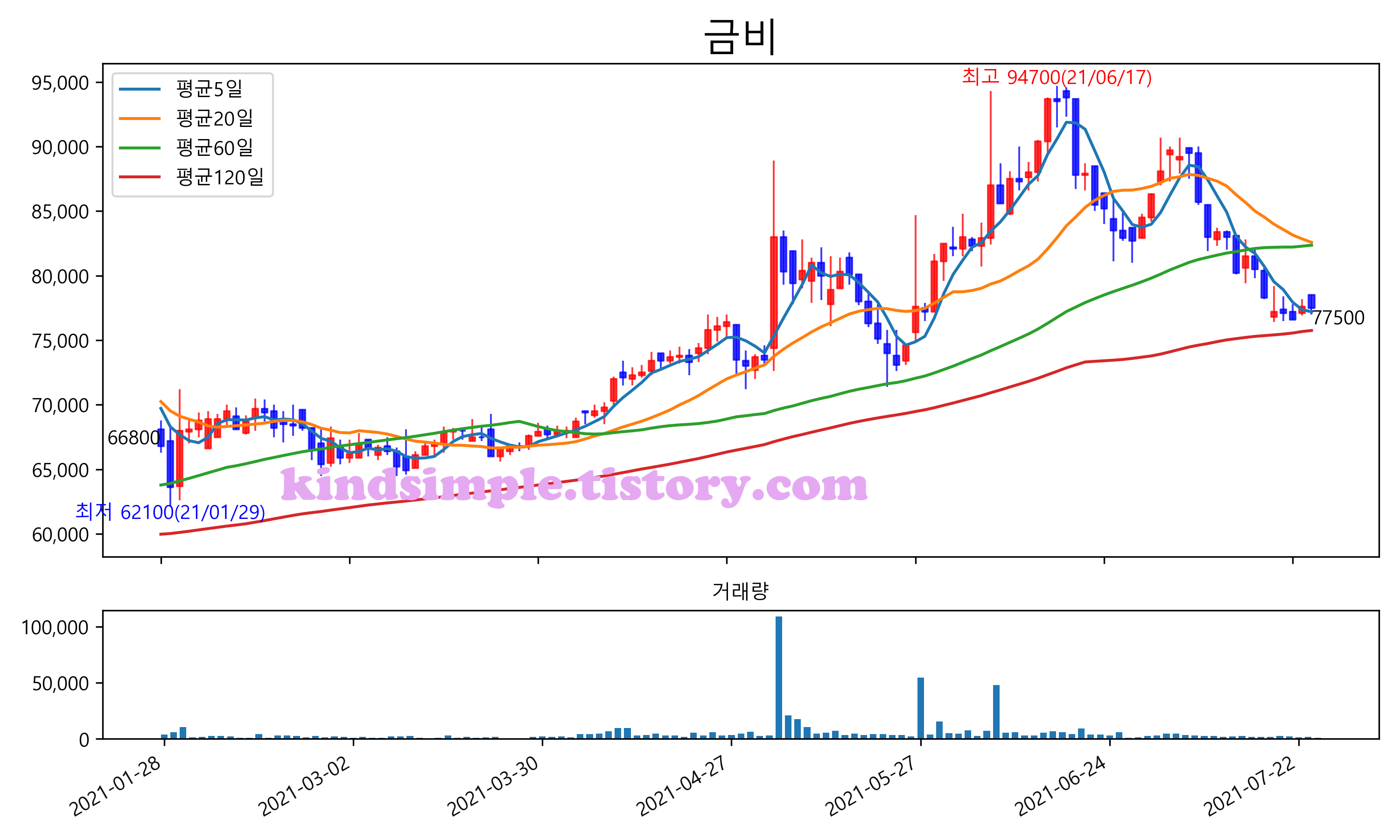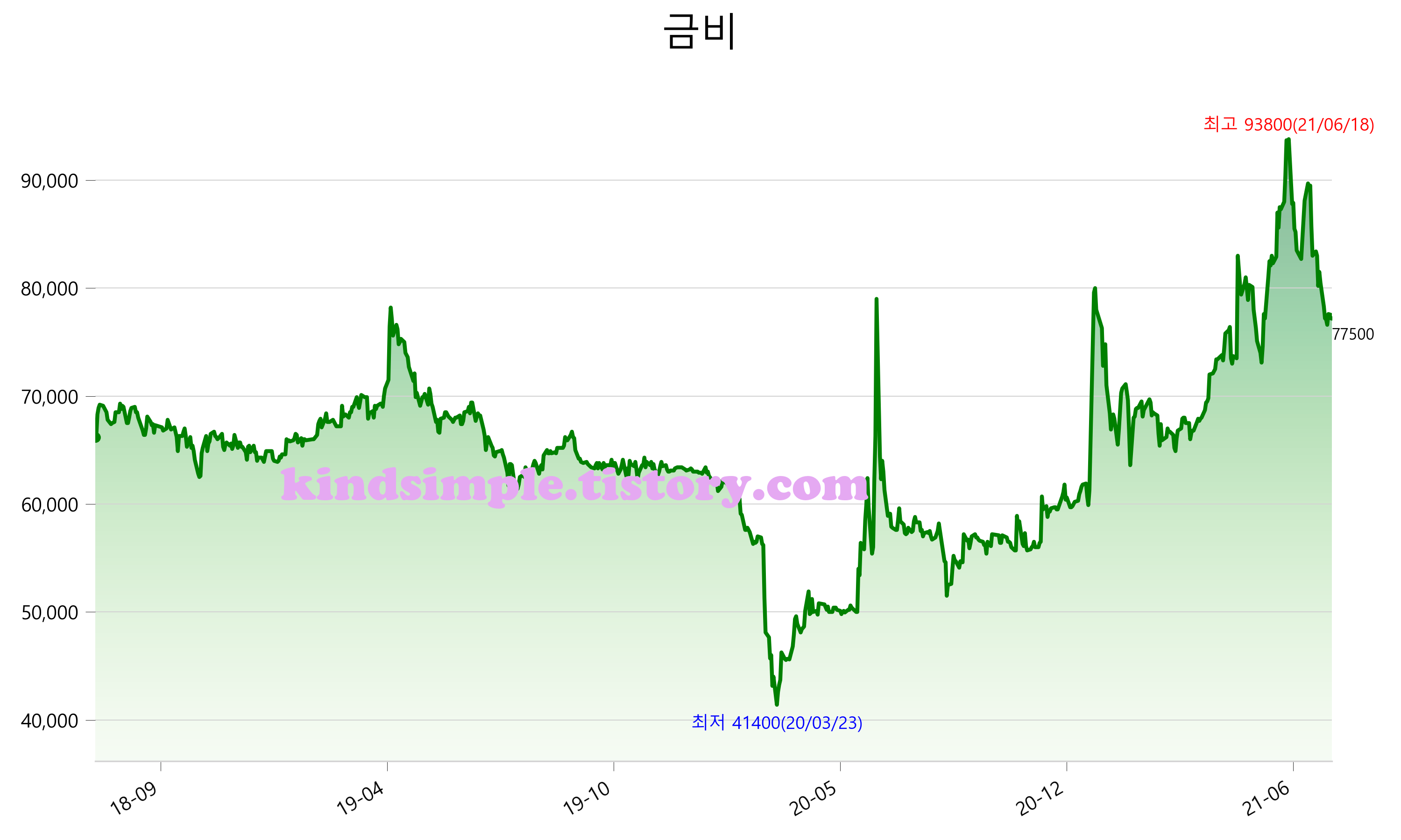7월 27일 기준 주가는 77,500원 입니다. 아래는 최근 3년간의 주가흐름입니다.