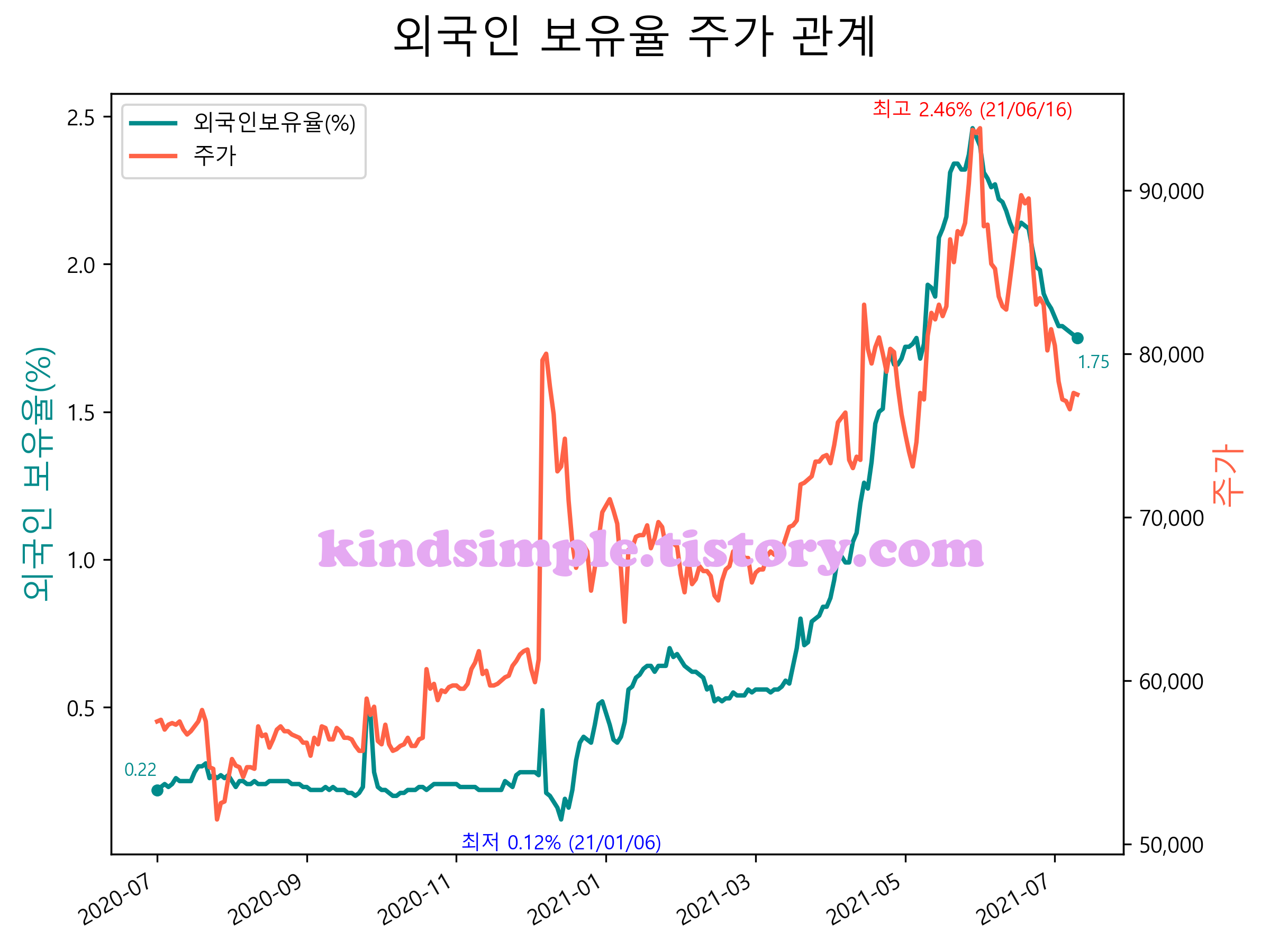 최근 1년간 외국인 보유율 및 주가와의 관계입니다.