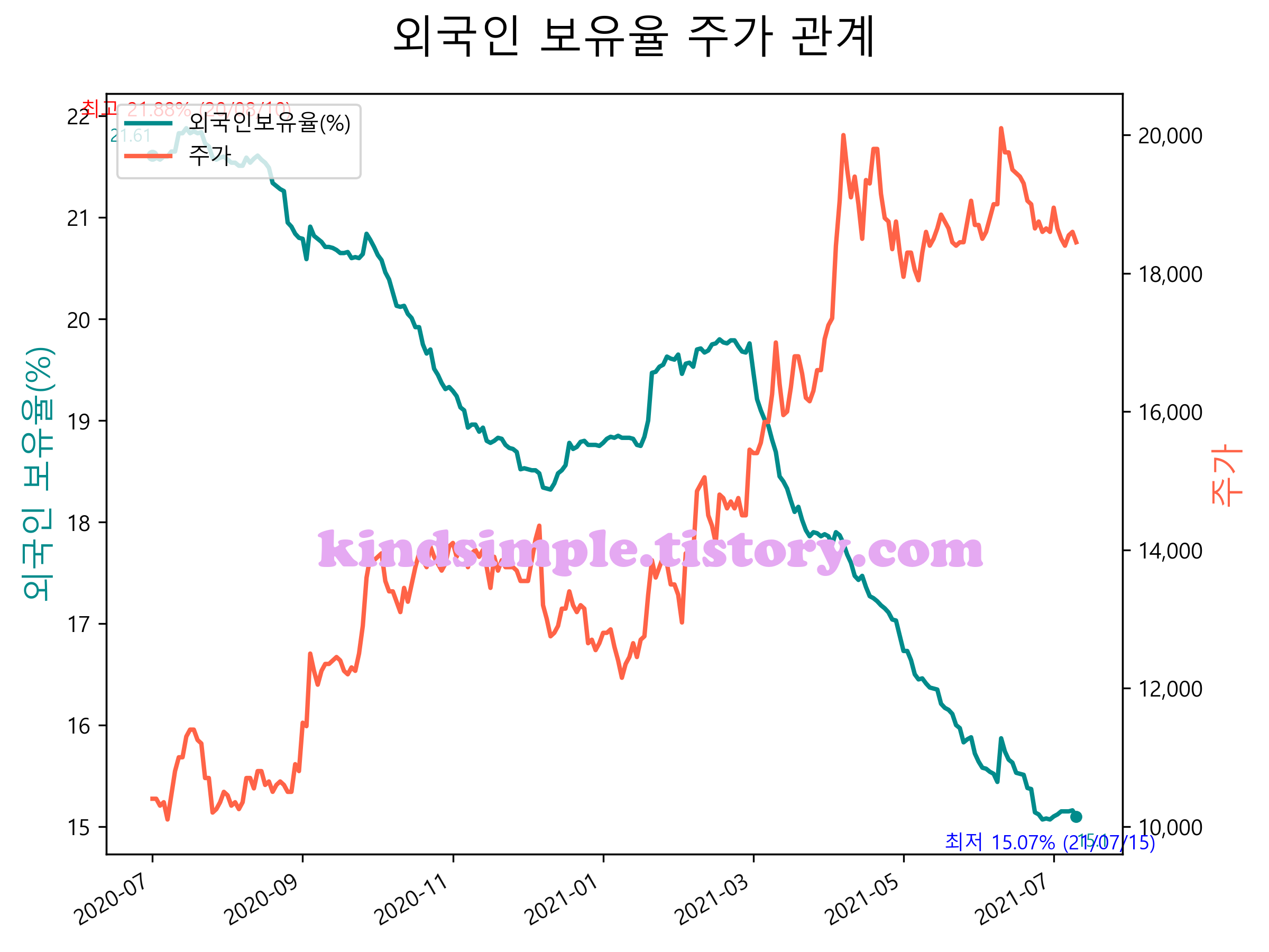 최근 1년간 외국인 보유율 및 주가와의 관계입니다.