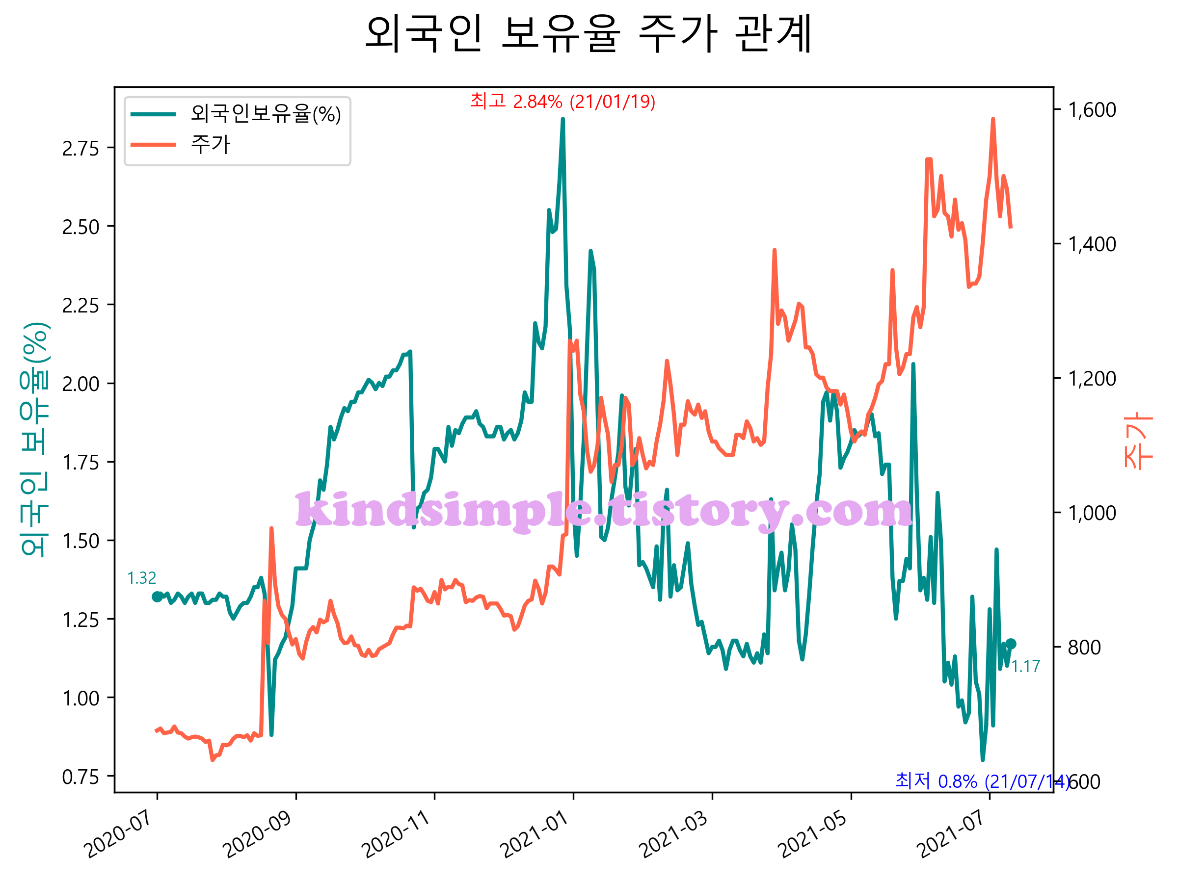 최근 1년간 외국인 보유율 및 주가와의 관계입니다.