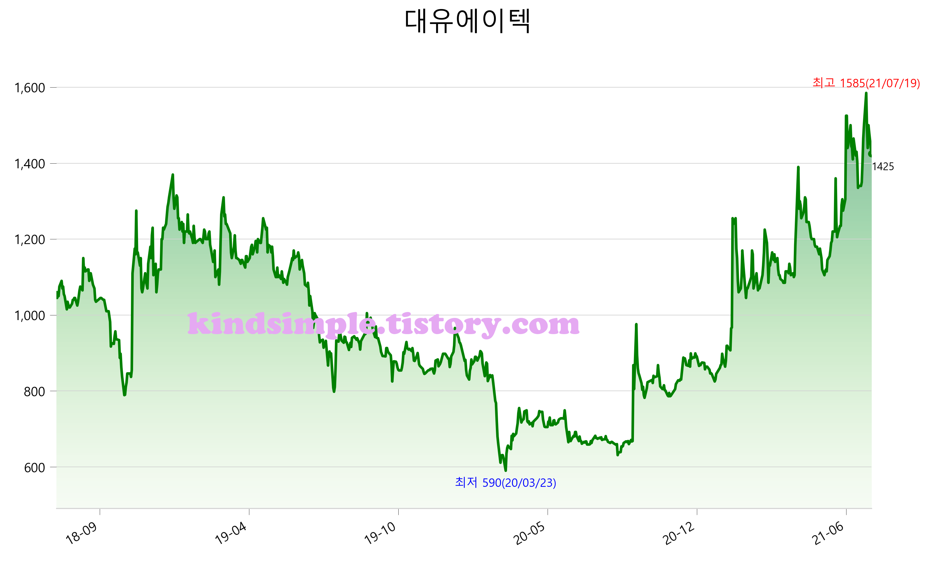 7월 27일 기준 주가는 1,425원 입니다. 아래는 최근 3년간의 주가흐름입니다.