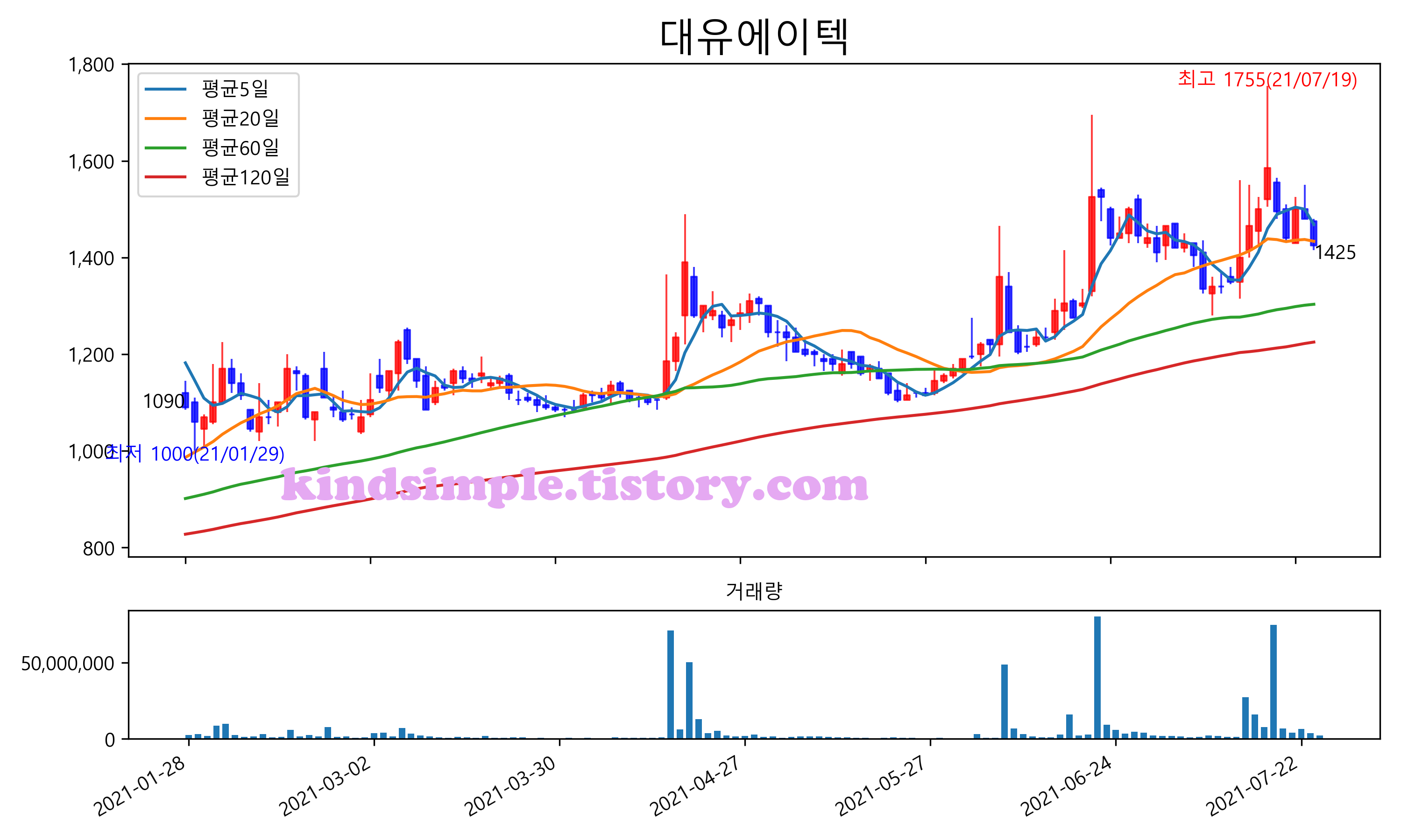 최근 6개월간 캔들차트 및 이동평균선입니다.
