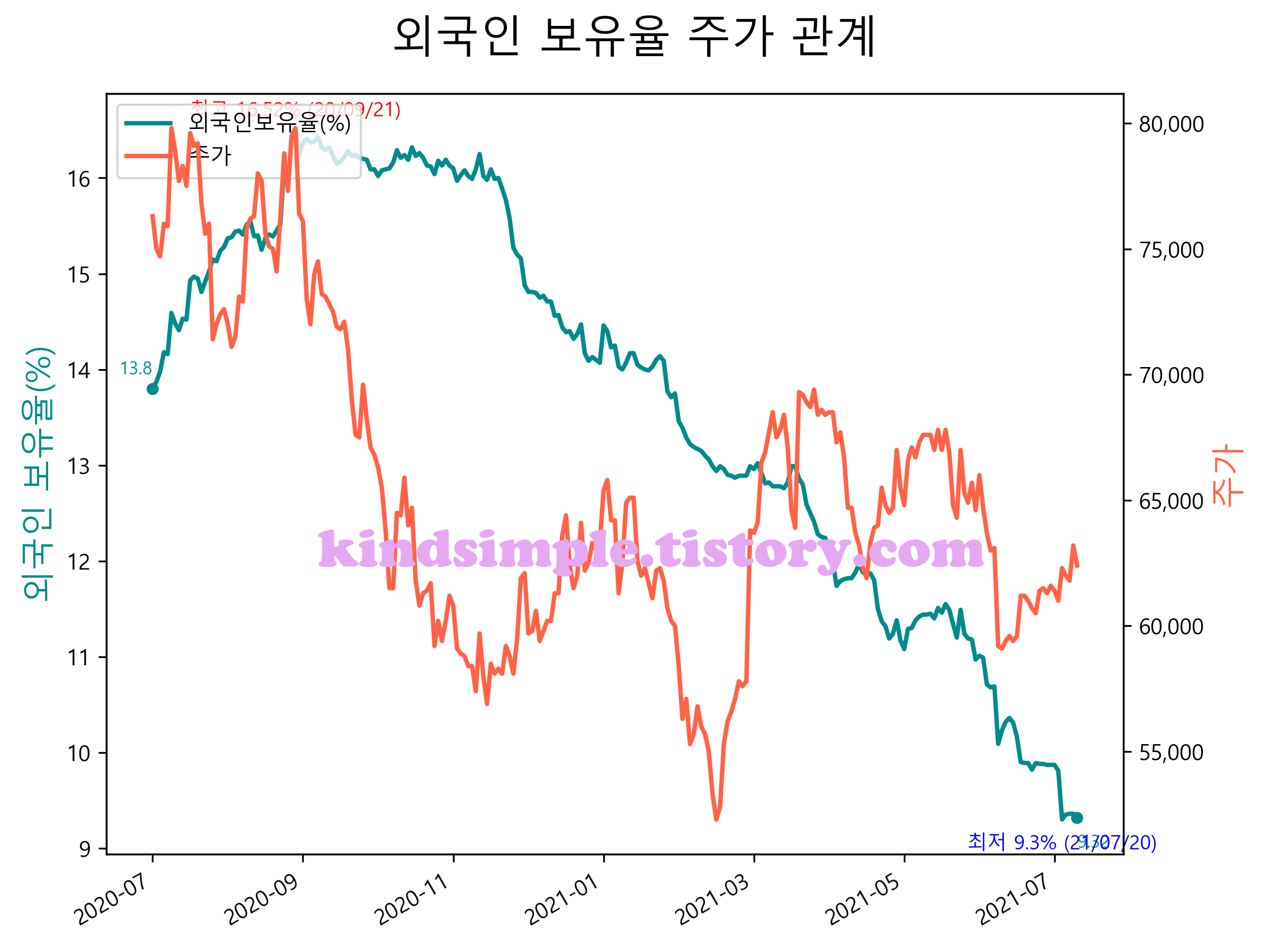 최근 1년간 외국인 보유율 및 주가와의 관계입니다.