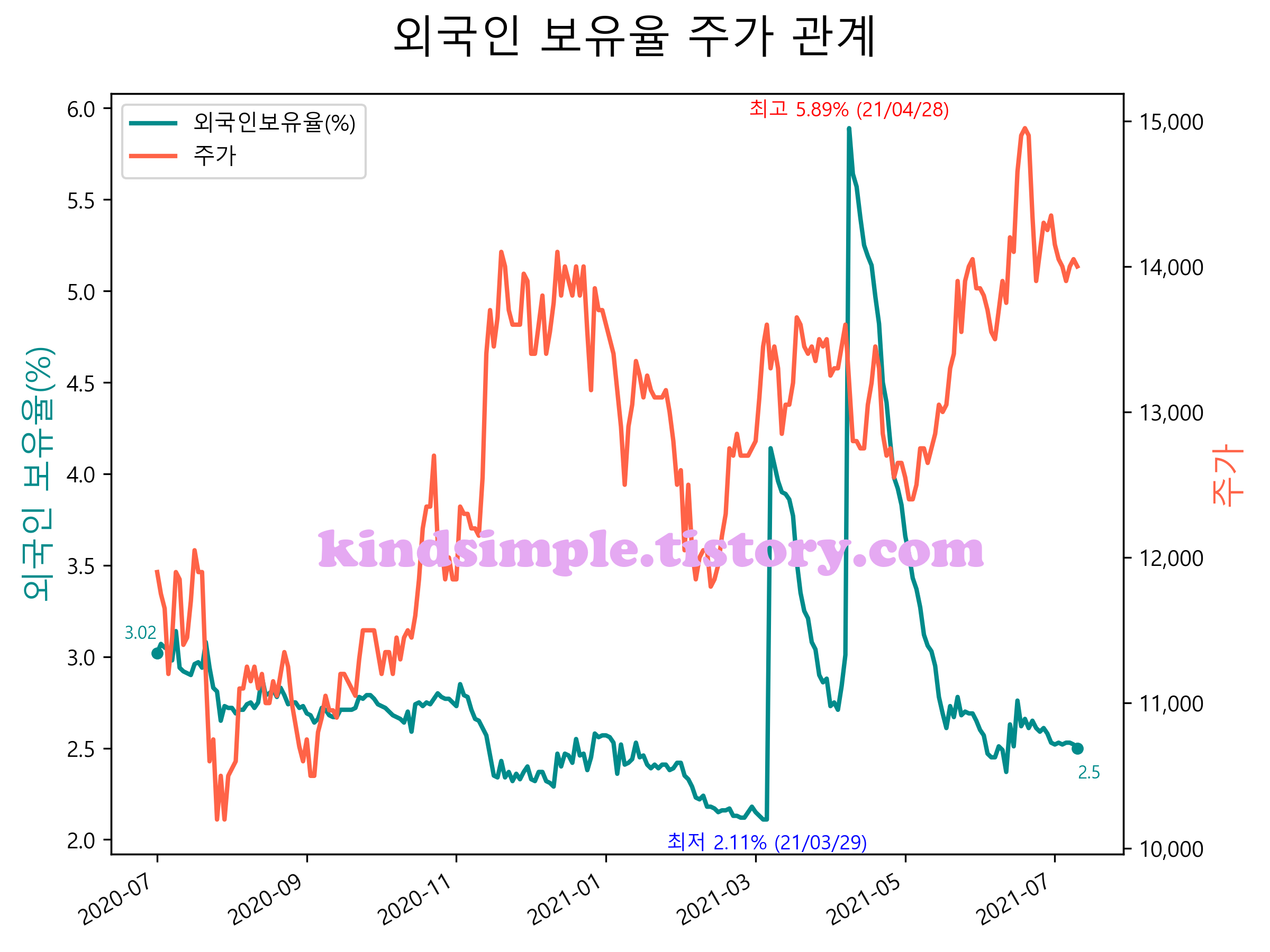 최근 1년간 외국인 보유율 및 주가와의 관계입니다.