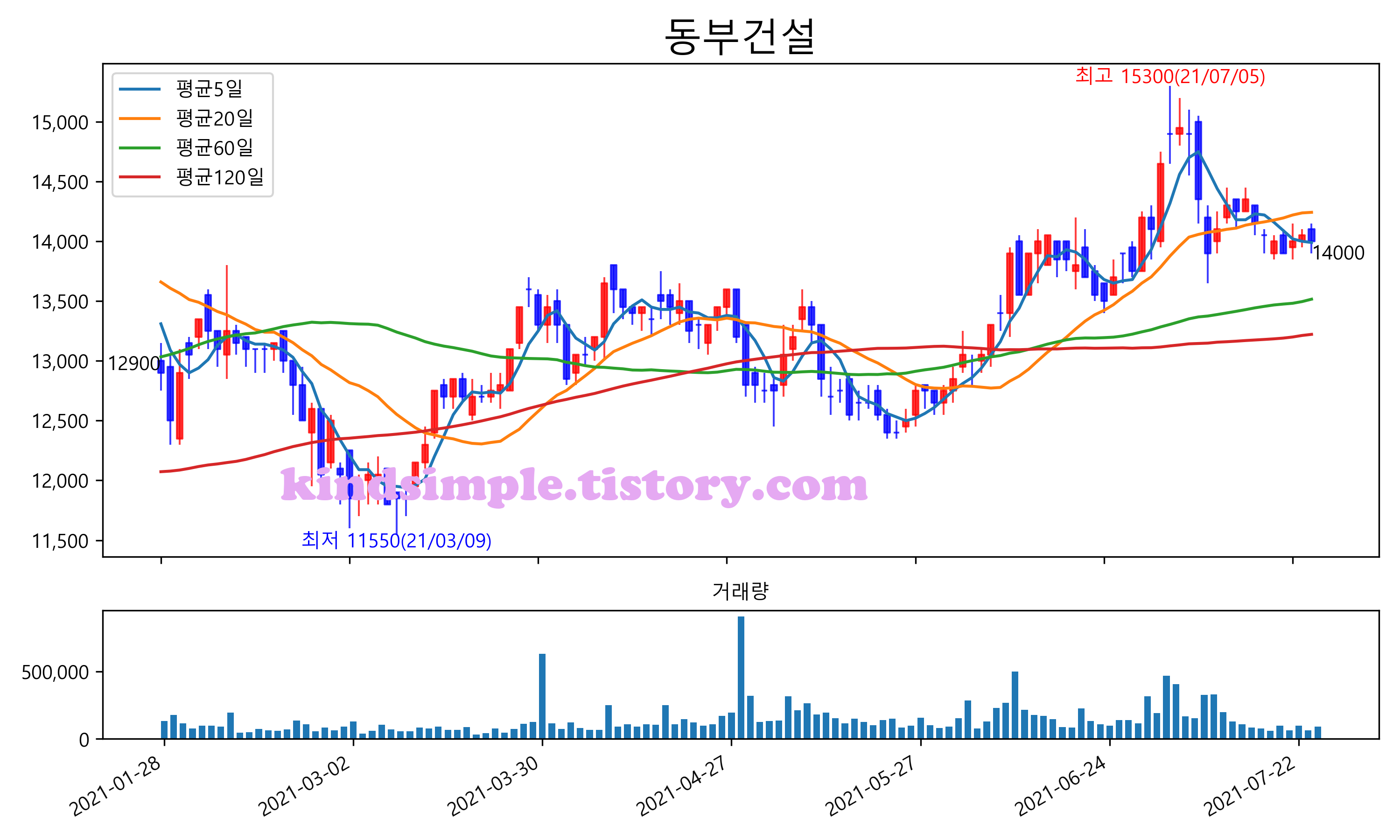최근 6개월간 캔들차트 및 이동평균선입니다.