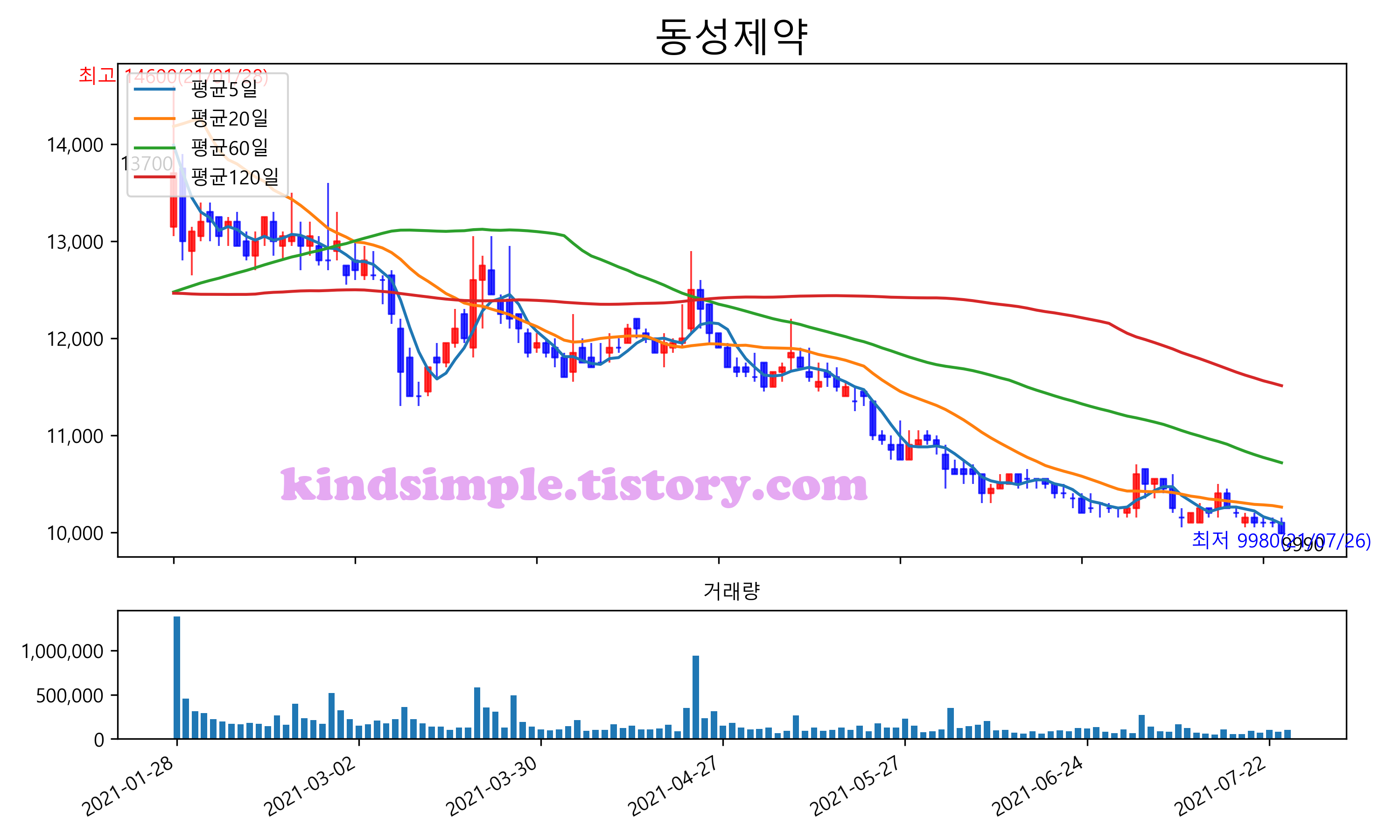 최근 6개월간 캔들차트 및 이동평균선입니다.