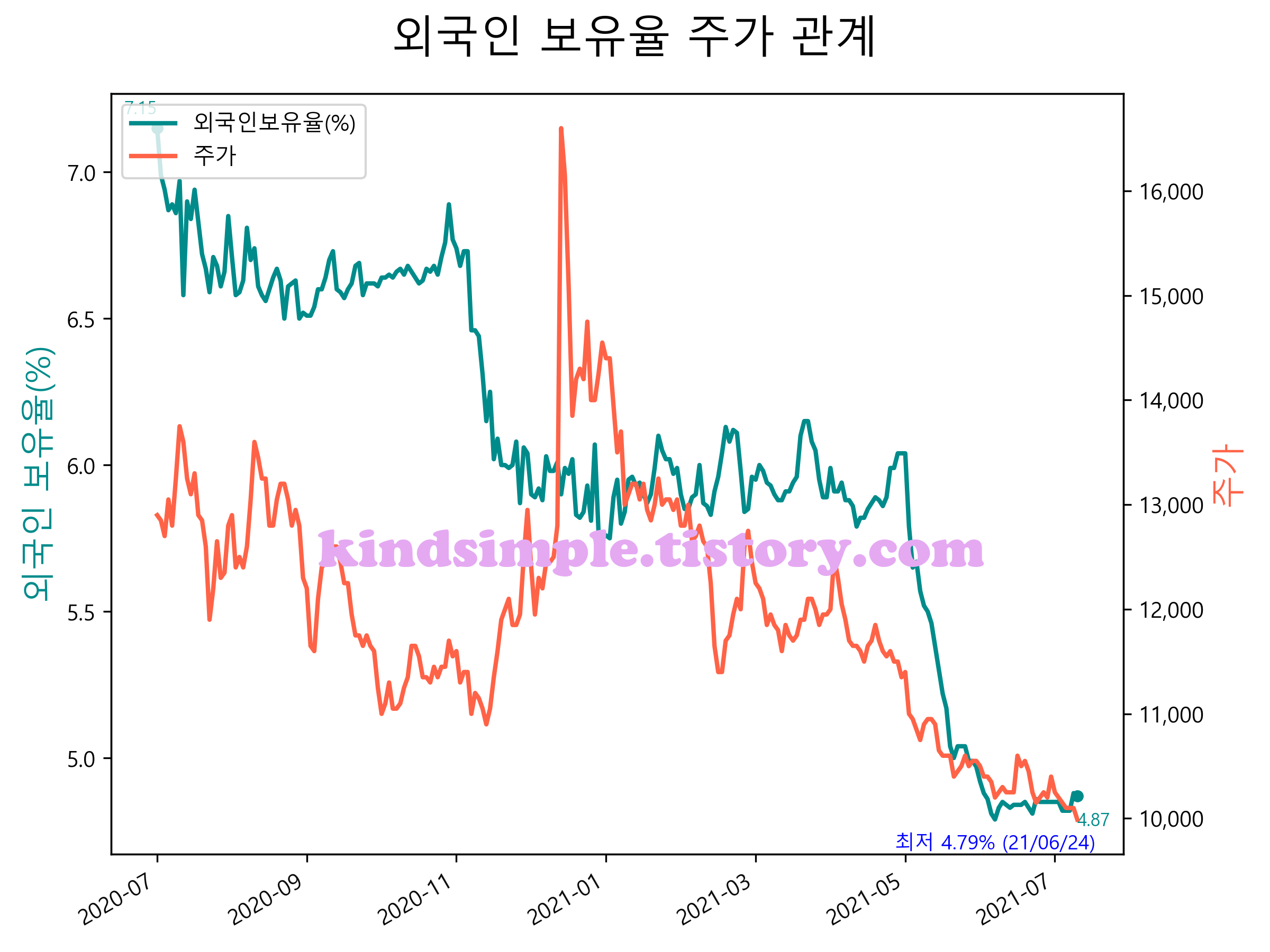 최근 1년간 외국인 보유율 및 주가와의 관계입니다.
