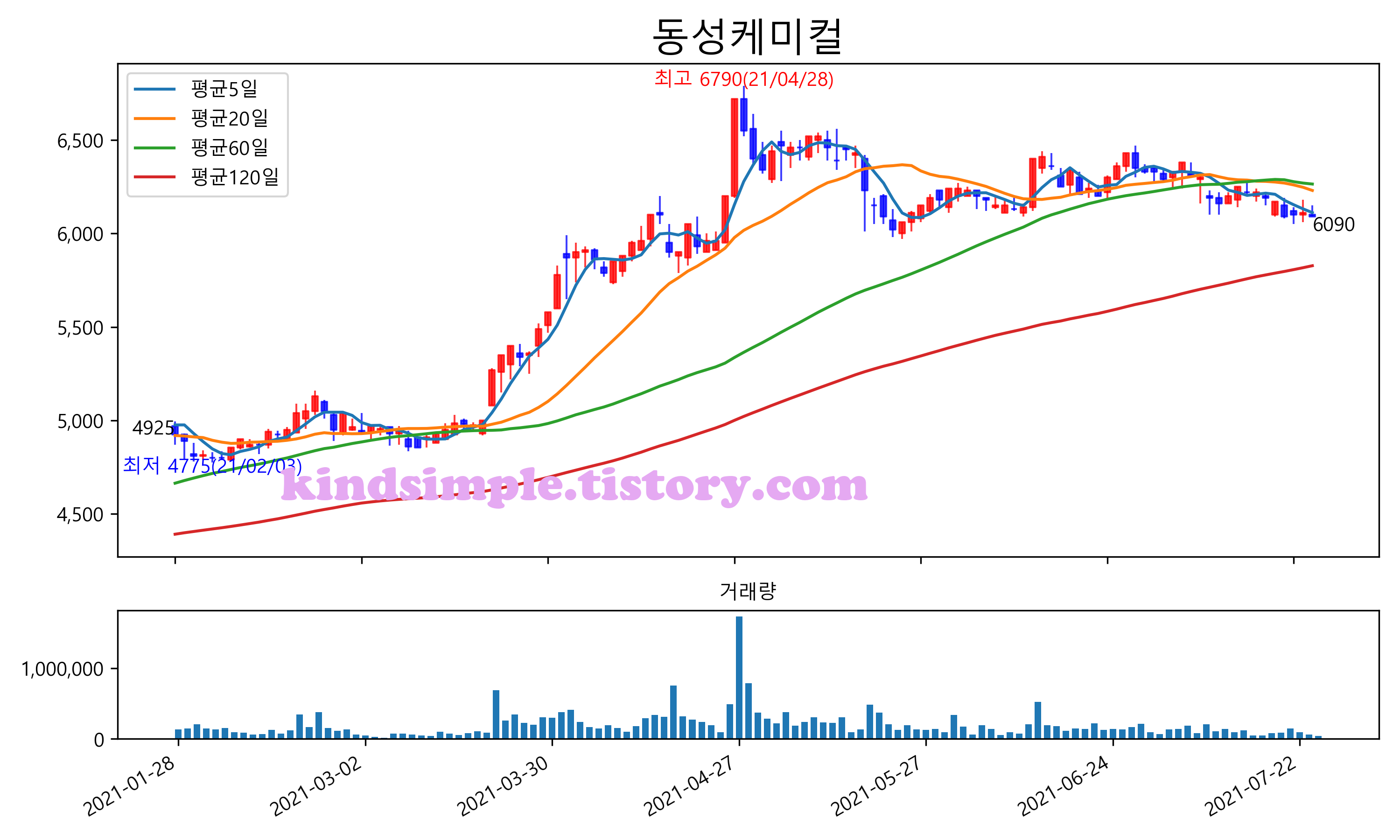 최근 6개월간 캔들차트 및 이동평균선입니다.