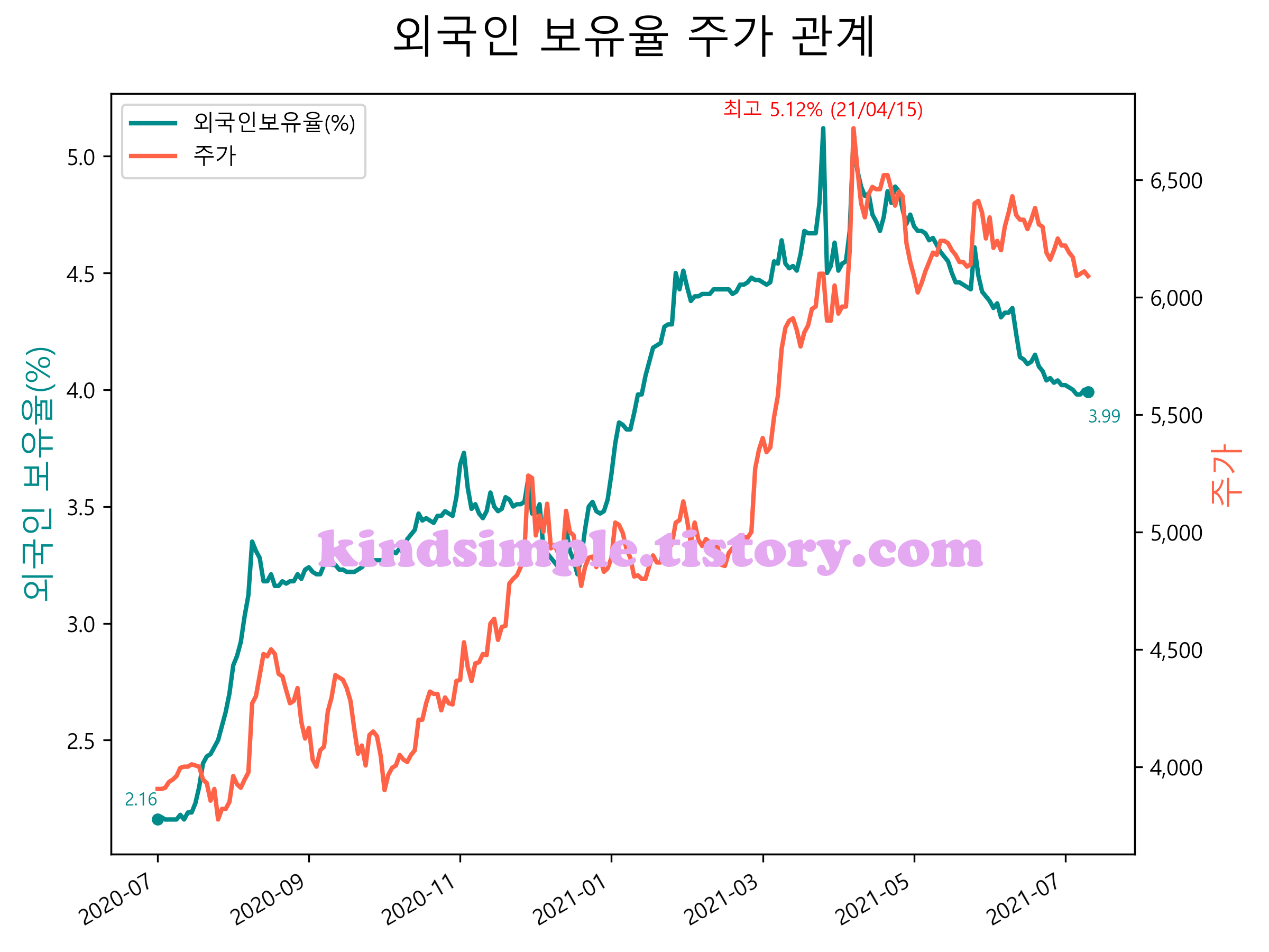 최근 1년간 외국인 보유율 및 주가와의 관계입니다.